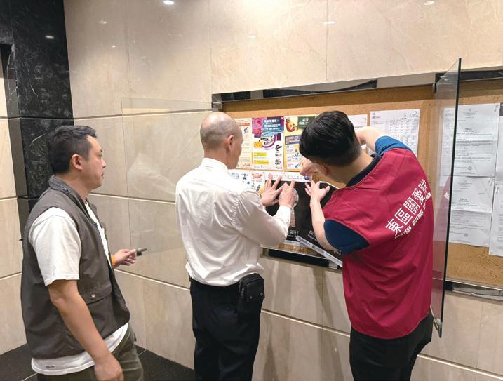 於此,浩景在屋苑保安小組的會議上 提出加強屋苑內的防騙宣傳。管 業處亦立即行動,在各大廈張 貼防騙宣傳海報。