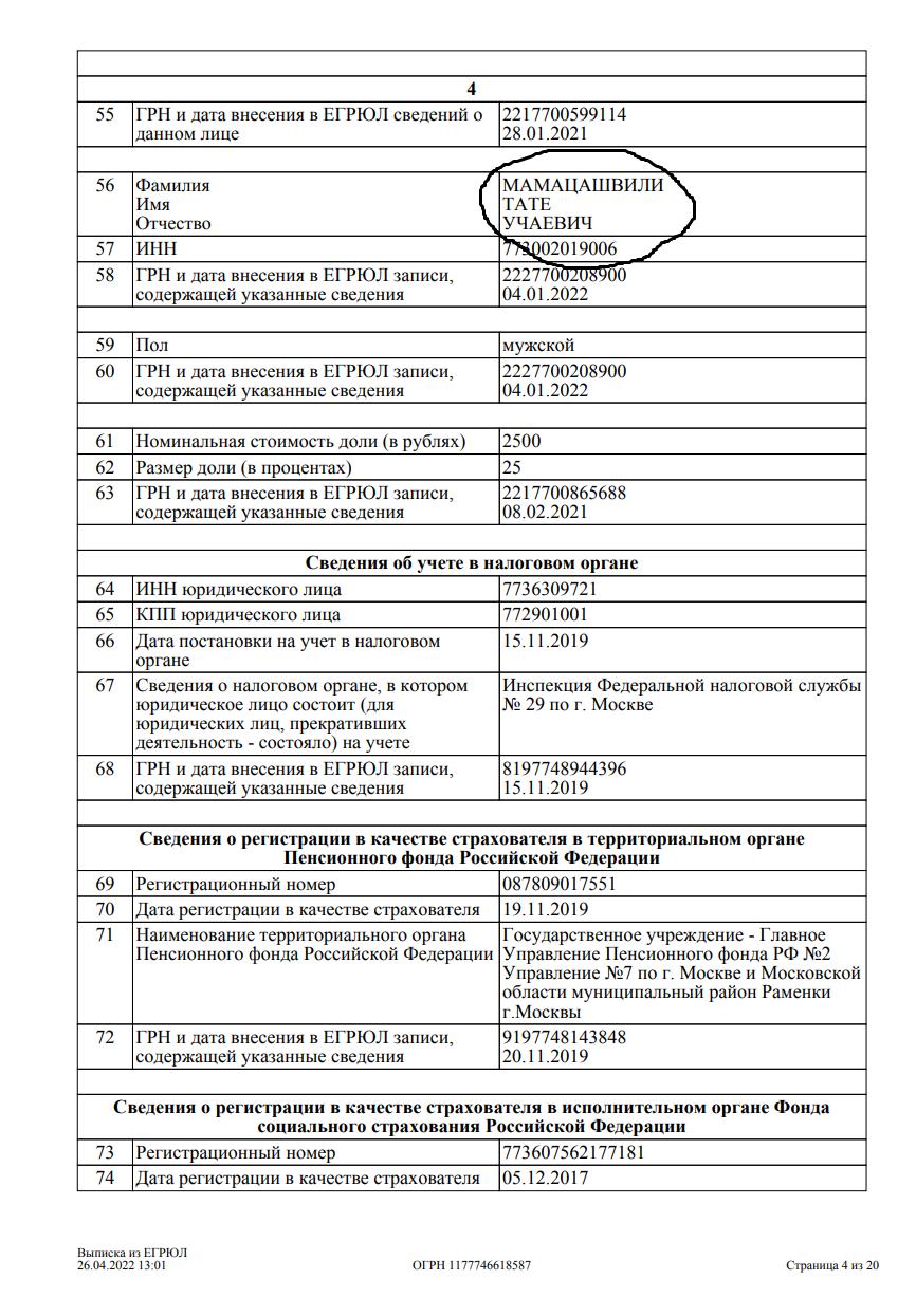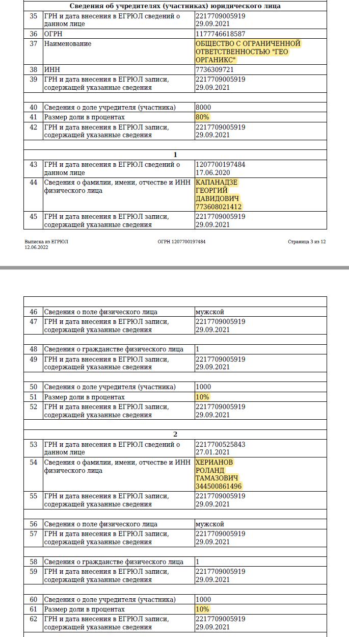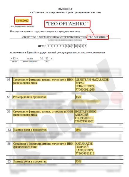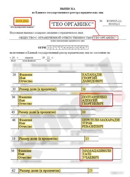 45 ოფიციალური ამონაწერების ფოტოები გადაღებულია 26 აპრილს, მას შემდეგ, რაც ევროპარლამენტის რეზოლუციაში შევიდა ცვლილება და ტექსტს დაემატა ბიძინა ივანიშვილის სანქცირება. აშკარაა, რომ ბიძინა ივანიშვილის დეიდაშვილს დასავლეთის სანქციების შეეშინდა, რადგან მისმა შვილმა, ტატე მამაცაშვილმა კომპანია GEO ORGANICS ში 25% იანი წილი გაასხვისადა 12 ივნისსდამოწმებულიდოკუმენტისმიხედვით, უჩამამაცაშვილისშვილს აღარეკუთვნისაქციებიამკომპანიაში მისი 25% იანიწილირუსეთშიმოღვაწებიზნესმენ გიორგი კაპანაძემ იყიდა.
