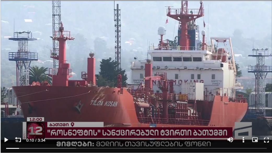 54 რუსული ნავთობტანკერები საქართველოს ტერიტორიულ წყლებში და საეჭვო გადაზიდვები 31 აგვისტოს ტელეკომპანია „მთავარი არხის“ ეთერში გავიდა ინფორმაცია lxvi იმის შესახებ, რომ რუსული ტანკერი სანქცირებული ტვირთით ბათუმის პორტში იმყოფება. "ატაკამას", რომელიც ჩამოვიდა ტუაფსედან, გამორთული ჰქონდა საიდენტიფიკაციო სისტემა და გემის წარმომავლობა საიდუმლოდ ინახებოდა. ამ მიზეზით ტანკერზე დეტალური ინფორმაციის მოპოვება რთულიიყო. „მთავარი არხის“ ინფორმაციით, ტანკერს 30 000 ტონა სანქცირებული რუსული მაზუთი გადაჰქონდა. ისინი ასევე აცხადებდნენ, რომ მაზუთი სანქცირებული რუსული სახელმწიფო ნავტობგიგანტის, „როსნეფტის“ საკუთრებაა „დროას“ წყაროები ადასტურებენ, რომ ტვირთი ნამდვილად ეკუთვნოდა „როსნეფტს“. იმის გამო, რომ ტვირთი არ ჩამოცლილა, „მთავარი არხი“ ვარაუდობს, რომ მისი წარმომავლობის ცვლილების შემდეგ, ის სხვა ქვეყანაში გადამისამართდება. წარმოშობის დოკუმენტაციის ცვლილების შემდეგ, საქართველო კიდევ ერთხელ გახდება სანქცირებული რუსული ნავთობის ტრანზიტის გზა გემის აგენტი საქართველოში არის „ტერო საზღვაო სააგენტო“, გადაზიდვისა და საექსპედიტორო სააგენტო კომპანია აცხადებს, რომ ისინი პასუხისმგებელნი არიან მხოლოდ ტანკერისქვეყანაში შესვლაზედაარავითარიკავშირი არაქვთ მის ტვირთთან ან მის გადმოტვირთვასთან.