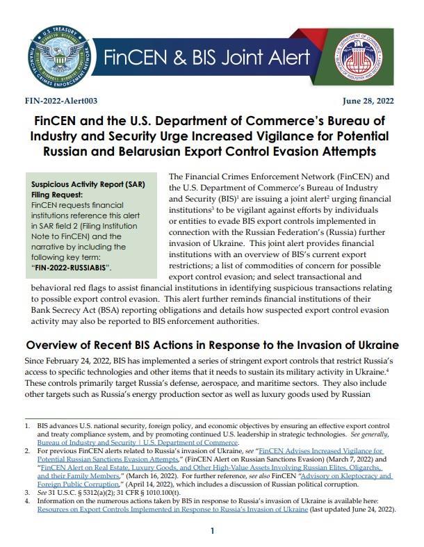 The document lists 22 transactional and behavioral red flags to help identify export control evasion. One of the red flags particularly concerns petroleum: