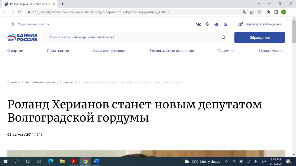 44 ვინ არის რონალდ ხეირანოვი? რონალდთამაზოვიჩხეირანოვიარისვოლგოროდისყოფილიმერიდასაქალაქოდუმის დეპუტატი რუსეთის მმართველი პარტიიდან. რონალდ ხეირანოვის მეუღლეა ანა კუვიჩკო, რუსი პოლიტიკოსი და მეშვიდე მოწვევის ფედერალური ასამბლეის რუსეთის სახელმწიფო დუმის დეპუტატი ერთიანი რუსეთის პარტიიდან. იგი ცნობილია სიმღერაში „Дядя Вова, мы с тобой“ („ძია ვოვა, ჩვენ შენთან ვართ“) მონაწილეობით.