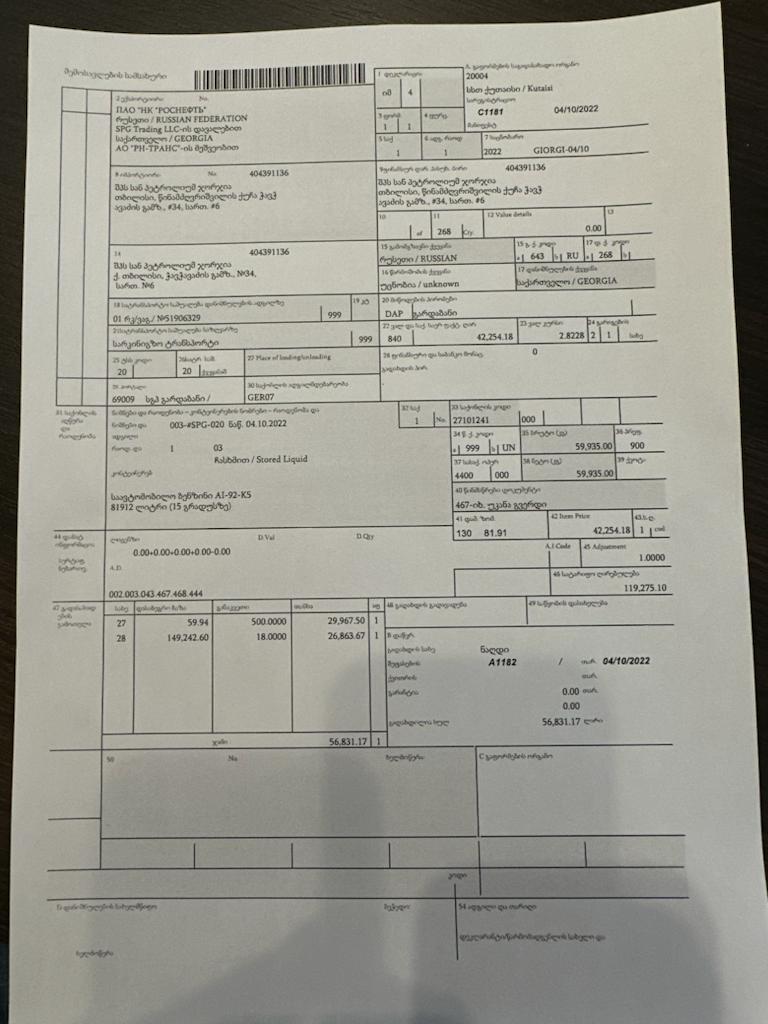 56 ნავთობისტრანსპორტირებასახდენდადაისკომპანია„ტერომ“შემოიტანა. ცნობილია, რომ „PLANEO“ ს მთავარი პორტი სანკტ პეტერბურგია და ის ძირითადად მარშრუტებს კვიპროსიდან ახორციელებს საქმე ეხება სქემას, რომელსაც საქართველოს მთავრობა იყენებს მას შემდეგ, რაც სანქციები დაწესდარუსეთის ტვირთებზე უკრაინის ომის შემდეგ ნავთობის მფლობელი სანქცირებული რუსული სახელმწიფო ნავთობკომპანია როსნეფტია. მიმღებიკომპანია გალფი პეტროკასის, ხოლოპეტროკასირუსბიზნესმენ დავითიაკობაშვილს ეკუთვნის 10 ოქტოლბერს „ანტიკორუფციულმა მოძრაობამ“ რუსული, სანქცირებული კომპანიის კუთვნილი ბენზინის საქართველოში შემოტანის მტკიცებულება გაასაჯაროვა ოფიციალური დოკუმენტის თანახმად, საქართველოში რუსეთიდან სახმელეთო გზით, რკინიგზით გარდაბნის საბაჟო გამშვები პუნქტიდან შემოვიდა რუსეთის სანქცირებული სახელმწიფო ნავთობგიგანტის, „როსნეფტის“ კუთვნილი 81 ათასი ტონა ბენზინი. მიმღები არის „სან პეტროლიუმ ჯორჯია“. ეს კომპანია უკრაინის მთავრობის მიერ დასასანქცირებელთა სიაში მყოფი “Petrocas Energy Group” ის საკუთრებაშია, თავად პეტროკასი კი ფორმალურად ასევე უკრაინის მიერ სანქცირებული რუსი ოლიგარქის დავით იაკობაშვილის და ივანე ნაკაიძის მფლობელობაშია იმპორტიორმა კომპანიამ, სავარაუდოდ, დამალა ინფორმაცია და ოფიციალურ დოკუმენტაციაში ჩაწერა, რომ პროდუქტის წარმოშობის ადგილი უცნობია და შემოსავლების სამსახურმა ასეთი ტვირთის საქათველოში შემოსვლა დასაშვებად მიიჩნია. სავარაუდოდ, ეს არის სანქციებისთვის თავის არიდების გზა, რადგან სანქციების ქვეშ არის როსნეფტის მომპოვებელი და ნავთობგადამამუშავებელი ქარხნები. შესაბამისად, მიმღებ კომპანიას არ სურდა გამოეჩინა ბენზინის წარმოშობის ადგილი და კავშირი სანქცირებულ ქარხნებთან.