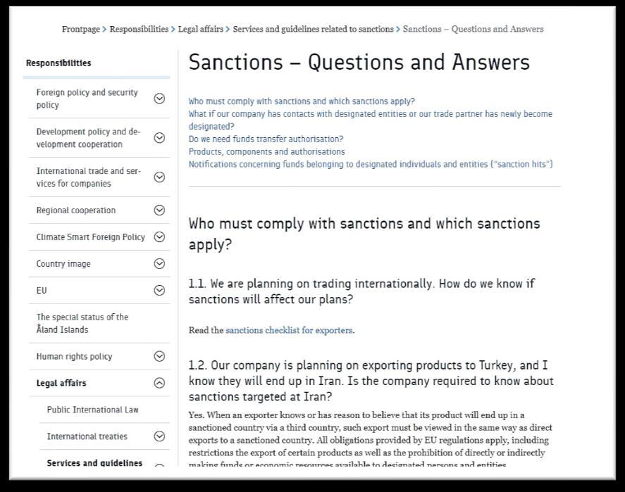 One of the purposes of a state is to ensure that its national businesspersons do not get accused of sanctions evasion or illicit deals. For this reason, the Ministry of Foreign Affairs of Finland has sanctions related services and recommendations published on its website, and any person interested can get information on existing restrictive norms as well as detailed information on how to comply with them.