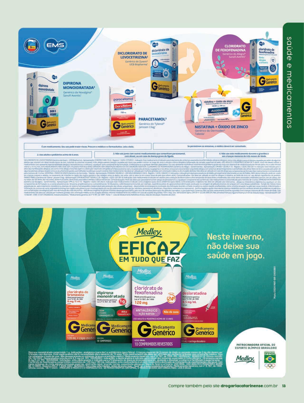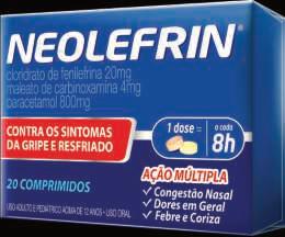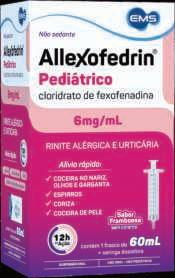 OLINA: M S 1 0299 0002 Princípios ativos: Extrato de Gentiana lutea e Extrato fluido de Aloeferox Indicação: indicado em casos de má digestão causada por excessos alimentares; laxante suave é indicado em casos de prisão de ventre Pela ação carminativa da Canela o medicamento OLINA propicia alívio ao mal estar gástrico causado pelo excesso de gases | EXPECTOVIC: M S 1 4493 0005 012-0 Princípio ativo: guaifenesina Indicações: indicado para o tratamento da tosse em gripes e resfriados | NEOLEFRIN: M S 1 5584 0214 004-3 Princípios ativos: paracetamol, cloridrato de fenilefrina, maleato de carbinoxamina Indicações: indicado para o tratamento dos sintomas das gripes e resfriados, como dor, febre, congestão nasal e coriza | NALDECON MULTI: M S 1 7390 0012 007-9 Princípios ativos: paracetamol, cloridrato de fenilefrina Indicações: indicado para o tratamento dos sintomas das gripes e resfriados, como dor, febre e congestão nasal | ALLEXOFEDRIN PEDIÁTRICO: M S 1 0235 1327 001-3 Princípio ativo: cloridrato de fexofenadina Indicações: indicado para o alívio das manifestações alérgicas tais como: rinite alérgica incluindo espirros, obstrução nasal (nariz entupido); prurido (coceira) no nariz, no palato (céu da boca), na garganta e nos olhos; coriza (nariz escorrendo); conjuntivite alérgica com sintomas de lacrimejamento e vermelhidão dos olhos; febre do feno (causada pelo pólen de algumas plantas); alergias da pele como os da urticária | NAPROXENO SÓDICO NEO QUÍMICA: M S 1 5584 0161 Princípio ativo: naproxeno sódico Indicações: indicada para dores agudas causadas por inflamação, dor e febre em adultos, dores musculares e articulares; dor após traumas Medicamento Genérico - Lei n° 9 787/99 | ACETILCISTEÍNA EUROFARMA: M S 1 0043 0772 002-9 Princípio ativo: acetilcisteína Indicações: indicado quando se tem dificuldade para expectorar e há muita secreção densa e viscosa, tais como bronquite aguda e crônica e suas exacerbações, enfisema pulmonar, pneumonia, colapso pulmonares, e mucoviscidose Também é indicado para intoxicação acidental ou voluntária por paracetamol Medicamento Genérico - Lei nº 9 787/99 | GEROVITAL EMS: M S 1 0235 0339 005-9 Princípios ativos: Panax Ginseng, polivitamínico e polimineral Indicações: é indicado na prevenção e recuperação em casos de fadiga física e mental, atuando como adaptógeno, ou seja, ajuda a melhorar a capacidade do nosso organismo de superar condições estressantes Também é indicado quando ocorre a falta de vitaminas e sais minerais