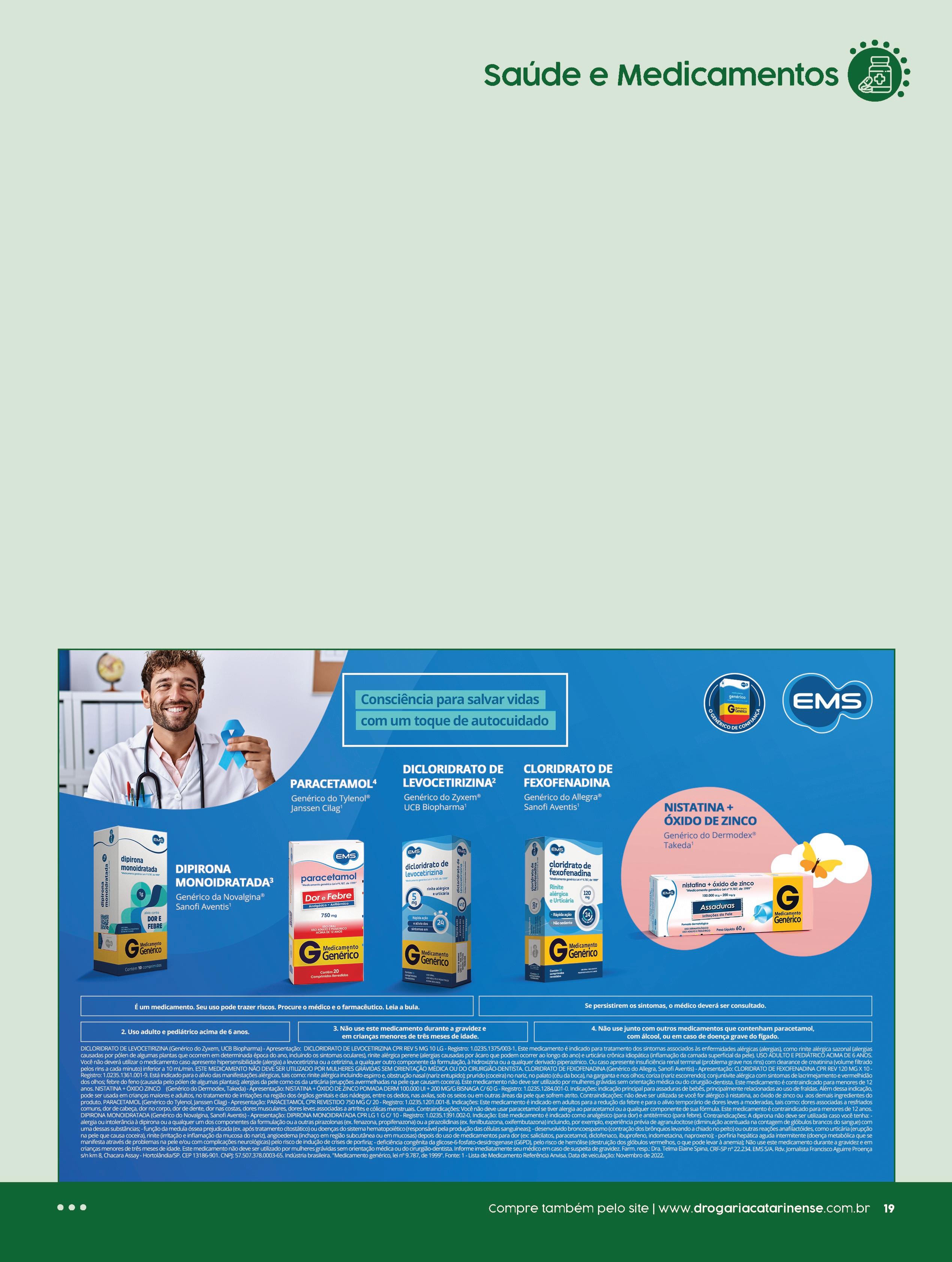 TROMBOFOB: M S 1 0553 0323 001 3 Princípio ativo: heparina sódica Contraindicações: pacientes com tendência a hemorragias; hipersensibilidade à substância ativa ou aos componentes da fórmula e em casos de intolerância aos anticoagulantes | MALVATRICIN: M S 1 0143 0024 037 1 Princípios ativos: tirotricina, sulfato de hidroxiquinolina, cloridrato de lidocaína Contraindicação: alergia a qualquer um dos componentes da formulação; crianças menores de 2 anos Este medicamento não deve ser utilizado por mulheres grávidas sem orientação do médico ou cirurgião dentista | PROMETAZINA: M S 1 0370 0691 015 1 Princípio ativo: prometazina Contraindicações: alergia aos componentes da formulação, dermatoses infectadas ou irritadas, eczemas e lesões exsudativas, menores de 2 anos "Medicamento Genérico Lei nº 9 787/99" | LORATADINA RANBAXY: M S 1 2352 0079 003 0 Principio ativo: loratadina Contraindicações: alergia aos componentes da fórmula "Medicamento Genérico Lei nº 9 787/99" | ACETILCISTEÍNA EUROFARMA: M S 1 0043 0772 001 0 Princípio ativo: acetilcisteína Contraindicações: alergia a acetilcisteína e/ou demais componentes de suas formulações; crianças menores de 2 anos Não deve ser usado por mulheres grávidas sem orientação médica ou do cirurgião dentista "Medicamento Genérico Lei nº 9 787/99" R$ 29,99 cada R$ 14,90 cada R$ 28,90 cada R$ 16,99 cada Trombofob Gel | 40g | cód 44509 R$ 24,90 R$ 21,90 cada cada Loratadina Ranbaxy c/ 12 comp | 10mg | cód 700946 R$ 23,90 R$ 15,90 cada cada Prometazina R$ 12,90 30g | 20mg/g | cód 740836 cada Gel hidratante íntimo Hyalufem R$ 76,99 24g | cód 732920 cada R$ 12,99 cada Malvatricin Solução spray | 50ml | cód 610499 R$ 41,90 R$ 38,99 cada cada Acetilcisteína Eurofarma c/ 16 envelopes | 100mg | cód 694280 R$ 26,99 R$ 22,99 cada cada