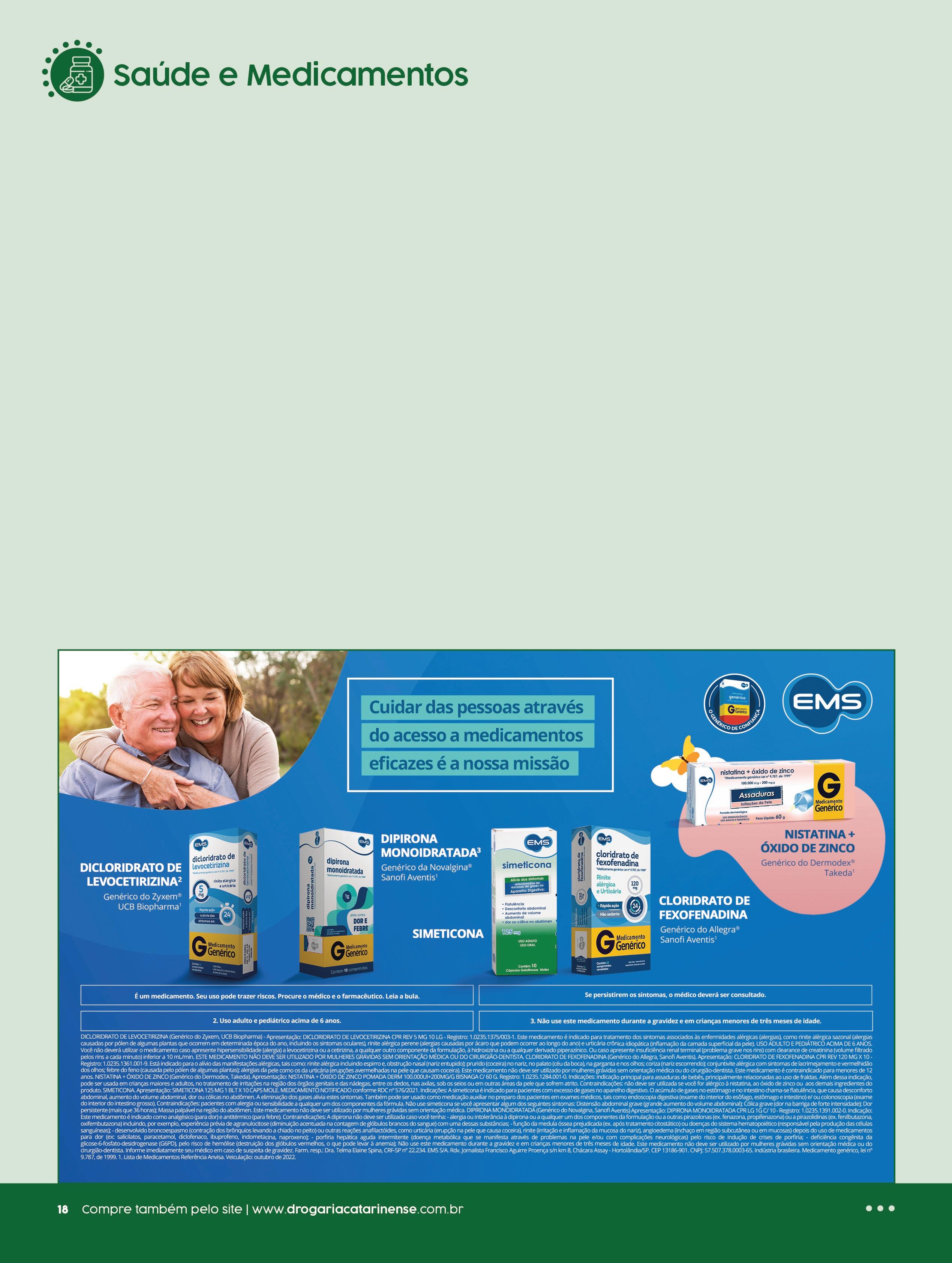 Princípio ativo: acetilcisteína Contraindicações: hipersensibilidade aos componentes da fórmula; gestantes, menores de 2 anos Medicamento Genérico - Lei nº 9 787/99 | IBUPRIL: M S 1 0370 0076 034-4 Princípio ativo: ibuprofeno Contraindicações: alergia aos componentes da fórmula; não use este medicamento em casos de úlcera, gastrite, doença dos rins ou se você já teve reação alérgica a anti-inflamatórios; menores de 12 anos; não deve ser utilizado por mulheres grávidas sem orientação médica Engov R$ 11,49 c/ 12 comp | cód 738351 cada R$ 10,99 cada R$ 29,34 cada R$ 13,90 cada R$ 19,99 cada R$ 15,99 cada Ibupril R$ 11,90 c/ 10 cáps | 400mg | cód 730366 cada Maleato de Dexclorfeniramina Cimed 120ml | 2mg/5ml | cód 741992 R$ 13,90 R$ 8,90 cada cada Própolis Minamel R$ 19,90 30ml | cód 743797 | 743798 cada Loratadina Ranbaxy c/ 12 comp | 10mg | cód 700946 R$ 19,90 R$ 15,90 cada cada Acetilcisteína Eurofarma c/ 16 envelopes | 5g | 600mg | cód 694277 R$ 51,90 R$ 44,90 cada cada