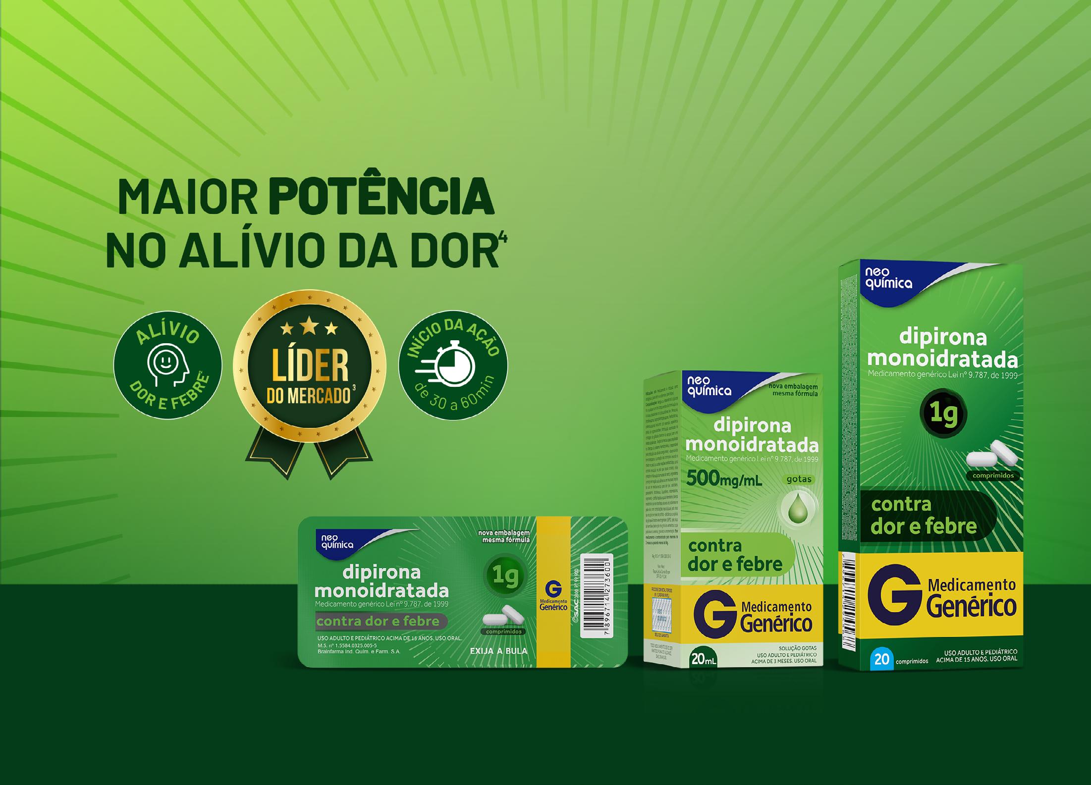 monoidratada 500mg/mL. Solução Gotas. MS 1.5584.0280. dipirona monoidratada 500mg e 1g. Comprimido. MS 1.5584.0325. Indicações: analgésico e antitérmico. Brainfarma Indústria Química e Farmacêutica S.A. SE PERSISTIREM OS SINTOMAS, O MÉDICO DEVERÁ SER CONSULTADO. Medicamento Referência: Novalgina Medicamento Genérico - Lei nº 9.787/99. 1. Anvisa. Lista A de medicamentos referência. Disponível em: https://www.gov.br/anvisa/pt-br/setorregulado/regularizacao/medicamentos/medicamentos-de-referencia/arquivos/lista-a-incluidos-16_06_2023.pdf Acesso em julho/2023. 2. Bula do produto Dipirona Monoidratada. 3. IQVIA PMB MAT Unidades (Julho/2023). 4. Dipirona com maior potência no alívio da dor vs aspirina - Mehta SD. A randomized double-blind placebo-controlled study of dipyrone and aspirin in post-operative orthopaedic patients. J Int Med Res. 1986;14(2):63-6. Cod.14.914. Agosto/2024