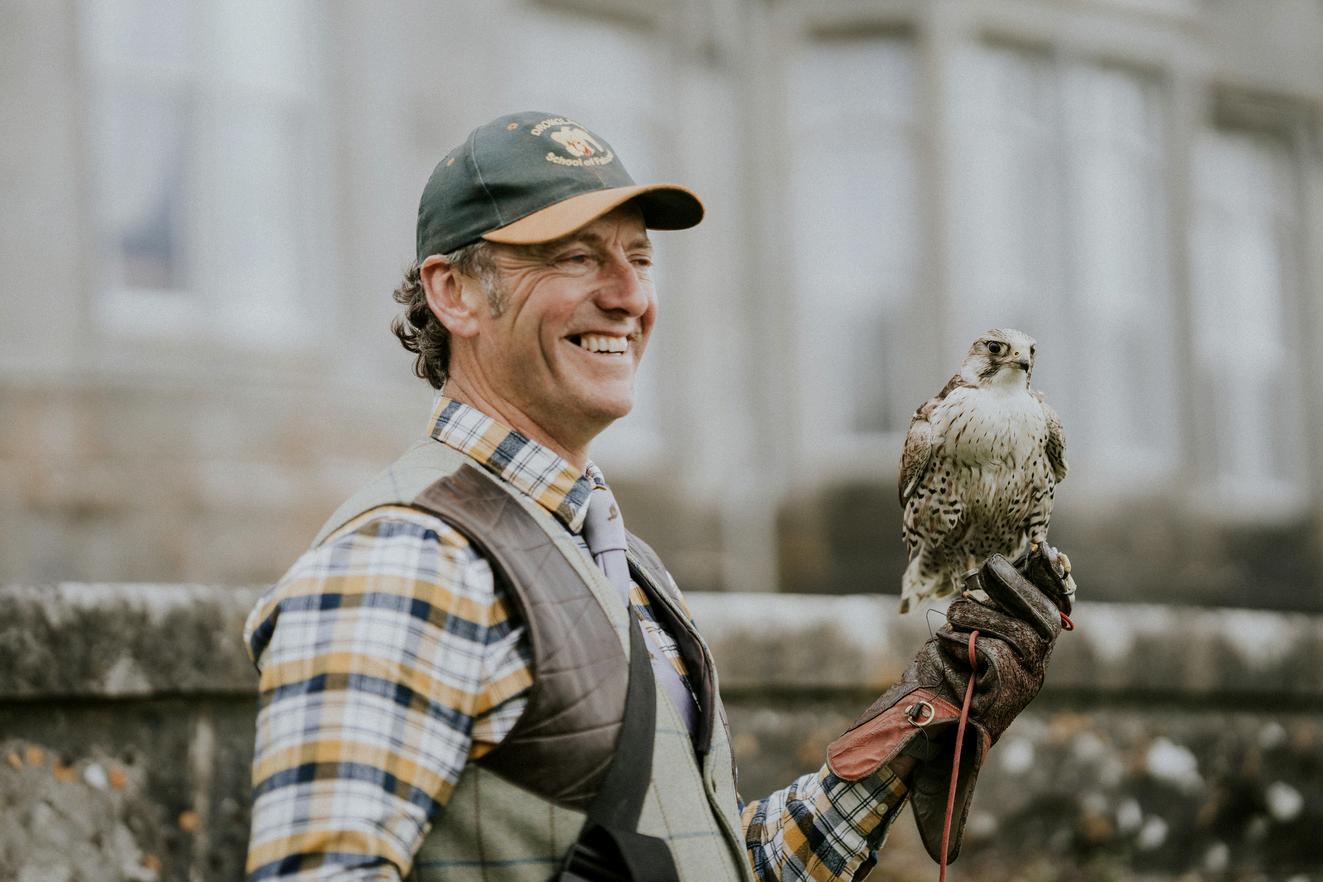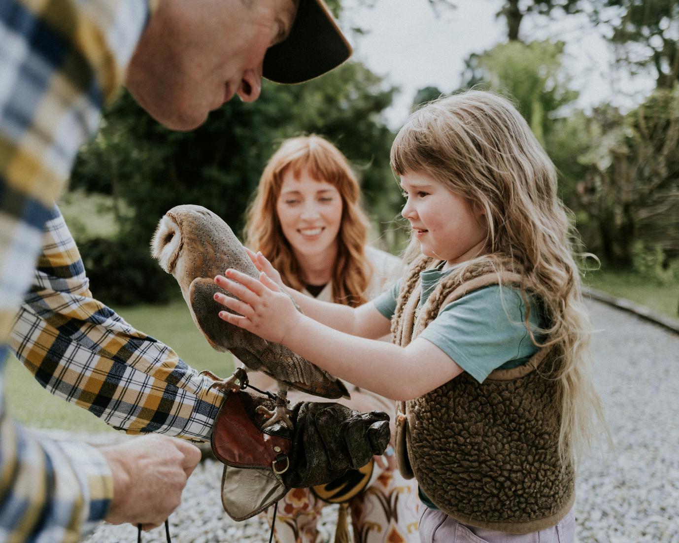 Dromoland Head Falconer Dave Atkinson with a young visitor on a Hawk Walk