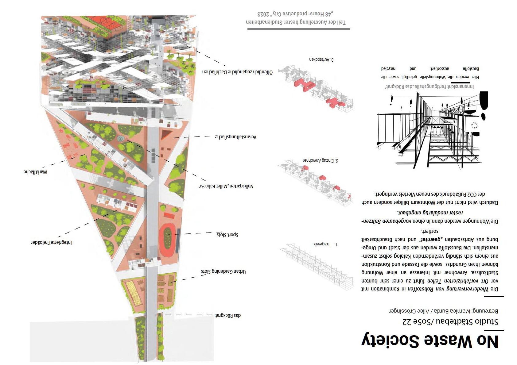 Ein Grätzl eigenes Designbüro befasst sich mit den Entwürfen der Wohnungen. Jeder Baustoff wird auf seine Recyclierbarkeit, Wirtschaftlichkeit und Energieeinsparung untersucht. Es soll möglichst wenig neu erzeugt werden. Wenn man davon ausgeht, dass im Stützenraster 5x5m pro 25m2 jeweils 1 Person wohnt, so können im gesamten Grätzl ca. 6100 Personen wohnen