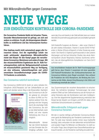 ZUR ENDGÜLTIGEN KONTROLLE DER CORONA-PANDEMIE Die Coronavirus-Pandemie bleibt ein brisantes Thema. Gesunder Menschenverstand ist gefragt, um sich und andere zu schützen. Es gilt, die körpereigenen Abwehrkräfte zu mobilisieren und das Immunsystem hochzufahren. Eine Impfung macht nicht automatisch gegen alle Coronaviren immun. Erst die regelmäßige Zufuhr von exakt aufeinander abgestimmten Mikronährstoffen rüstet den Körper für den Kampf gegen die verschiedenen Coronavirus-Mutationen und andere Erreger. Mit den wissenschaftlichen Ergebnissen des Dr. Rath Forschungsinstituts steht der Weltgemeinschaft erstmals ein wissenschaftlich gesicherter Weg zur Verfügung, um eine wirksame, nebenwirkungsfreie und sofort umsetzbare Gesundheitsstrategie gegen die COVID19-Pandemie zu entwickeln.