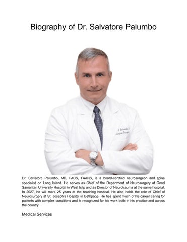 Dr. Salvatore Palumbo, MD, FACS, FAANS, is a board-certified neurosurgeon and spine specialist based on Long Island. He serves as Chief of the Department of Neurosurgery and Director of Neurotrauma at Good Samaritan University Hospital in West Islip, where he will mark 25 years of service in 2027. He also holds the position of Chief of Neurosurgery at St. Joseph’s Hospital in Bethpage. He has dedicated much of his career to managing complex neurological conditions and is recognized for his expertise in his practice and nationwide. Dr. Salvatore applies a patient-first approach, combining advanced surgical techniques with personalized care plans. He evaluates each patient carefully to identify the most effective and least invasive treatment options. His goal is to reduce pain while improving function, mobility, and overall quality of life. He has treated thousands of patients on Long Island with conditions affecting the spine, neck, brain, and peripheral nerves. His surgical experience includes intracranial procedures, complex spinal operations, and spinal reconstruction for both degenerative and traumatic disorders. Salvatore Palumbo, MD, has extensive experience treating intracranial tumors and other neurological conditions. His procedures range from minimally invasive microdiscectomies to multi-level spinal stabilization surgeries. He treats conditions such as back and leg pain, arm and neck pain, sciatica, herniated discs, degenerative disc disease, spinal stenosis, compression fractures, traumatic brain injuries, tumors, and carpal tunnel syndrome. Dr. Salvatore has been recognized as a Top Doctor in America and on Long Island, and received the Outstanding Physicians Award during his time in Pennsylvania. Patients often share positive feedback, describing him as attentive, communicative, and supportive throughout their care.
