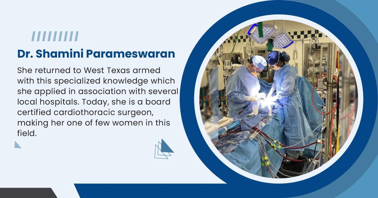 Having a chance to be mentored by Dr. John Elefteriades, a pioneer in aortic aneurysm surgery, Dr. Parameswaran developed a strong interest in this field. She returned to West Texas armed with this specialized knowledge, which she applied in association with several local hospitals. Today, she is a board-certified cardiothoracic surgeon, one of the few women in this field.