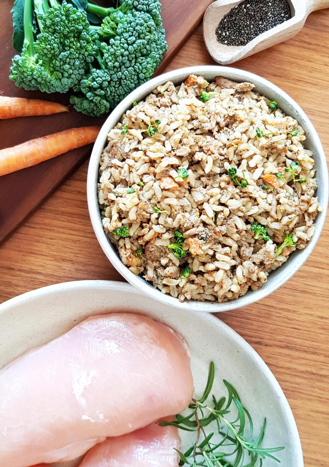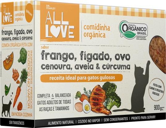 INGREDIENTES: carne de frango orgânico, carne de frango orgânico com ossos, fígado de frango orgânico, moela de frango orgânico, arroz integral orgânico, cenoura orgânica, ovo integral orgânico, óleo de soja orgânico, abóbora orgânica, semente de chia orgânica, grão de linhaça orgânico, aveia orgânica, brócolis orgânico, couve orgânica, espinafre orgânico, água*, levedura inativada desidratada*, biomassa de microalga Schizochytrium sp*, semente de psyllium*, fibra de cana de açúcar*, vitaminas (A, D, E, K3, C, B1, B2, B3, B5, B6, B12, biotina, ácido fólico, fosfatilcolina), minerais (selenito de sódio, sulfato ferroso, sulfato de cobre, iodato de cálcio, sulfato de zinco, organozinco, sulfato de manganês, organomanganês, organoselênio)*, cloreto de potássio*, cloreto de sódio*, metionina*, triptofano*, taurina*, concentrado de tocoferol*, extratos vegetais (yucca, hortelã, chá verde, alecrim e alcachofra)*, cúrcuma* (*ingredientes não orgânicos).