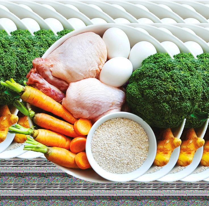 INGREDIENTES: carne de frango orgânico com ossos, fígado de frango orgânico, arroz integral orgânico, cenoura orgânica, abóbora orgânica, ovo orgânico, óleo de soja orgânico, semente de chia orgânica, grão de linhaça orgânica, água*, levedura inativada desidratada*, farelo de goiaba*, colágeno hidrolisado*, biomassa de microalgas Schizochytrium sp*, salsinha e orégano desidratados*, vitaminas (A, D3, E, K3, B1, B2, B5, B6, B12, C, niacina, ácido fólico, biotina)*, fosfatilcolina*, minerais (sulfato de ferro, sulfato de cobre, sulfato de manganês, organomanganês, sulfato de zinco, organozinco, iodato de cálcio, selenito de sódio, organoselênio)*, cloreto de potássio*, metionina*, taurina*, tocoferol*, extratos vegetais (alecrim, hortelã, chá verde, yucca, equinácea e alcachofra)*, aloe vera*, extrato de própolis*, cúrcuma* (*ingredientes não orgânicos).