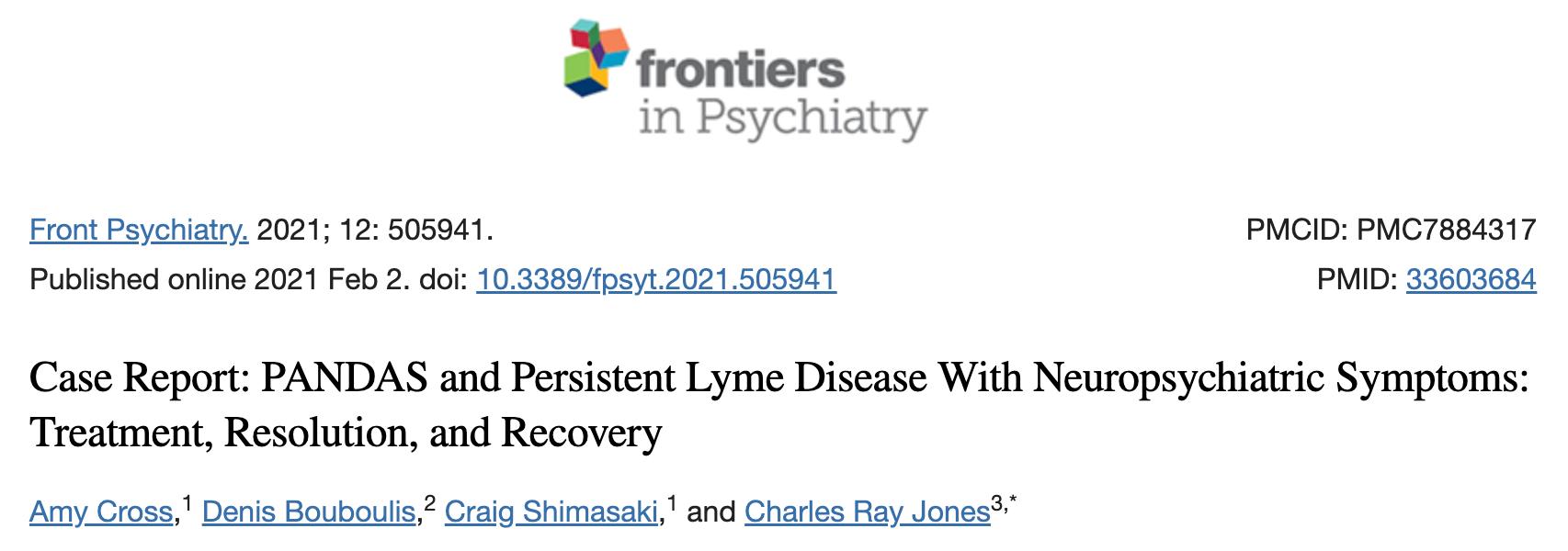 ´ Cross, A., Bouboulis, D., Shimasaki C., & Jones, C. R. (2021). Case Report: PANDAS and Persistent Lyme Disease With Neuropsychiatric Symptoms: Treatment, Resolution, and Recovery. Frontiers in Psychiatry, 12. https://doi.org/10.3389/fpsyt.2021.505941