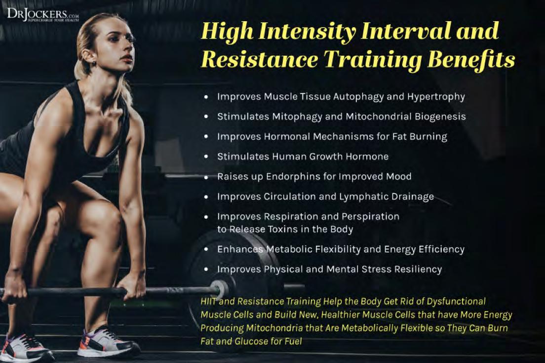 High intensity exercise and resistance training help stimulate human growth hormone (HGH) which creates an environment that favors fat burning, autophagy and muscle tissue repair and preservation. The boost in HGH is higher when the individual is in a fasted state.