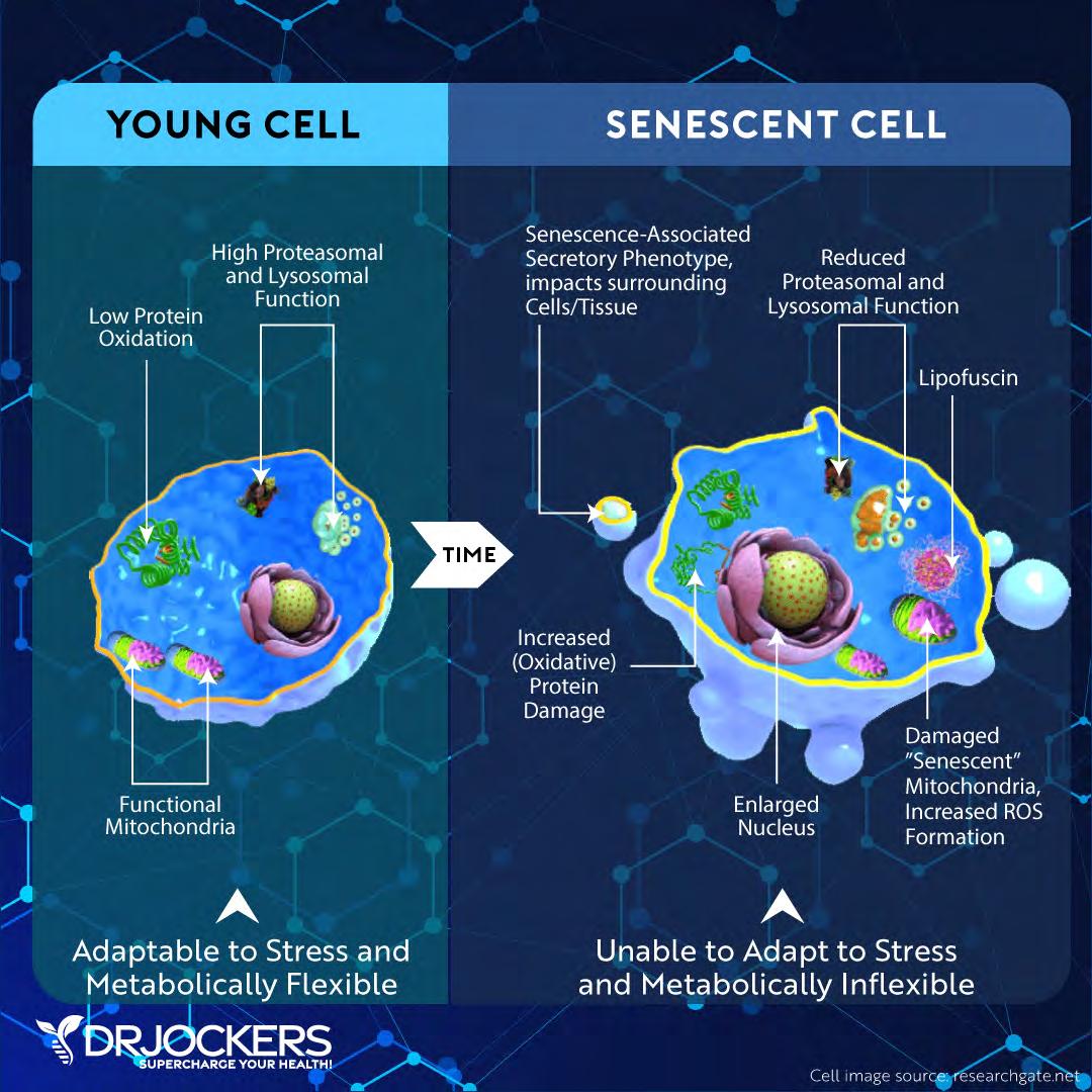 All cells have a certain lifespan and younger cells have dealt with less wear and tear and are more efficient in their particular functions. A senescent cell is an older cell that is not functioning at a high level. It is still working but at a much lower level of efficiency and not effectively enough to maintain the overall health of an organ or tissue of the body. These cells are metabolically inflexible and have trouble using fatty acids for fuel. They rely on sugar/glucose metabolism and produce energy very inefficiently and create a lot of metabolic waste and produce cell signaling factors that promote inflammatory conditions in the body.