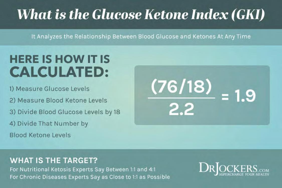 The GKI is found by taking the blood glucose level and dividing it by 18. You then take that number and divide it by the blood ketone level. A blood sugar of 64 with ketone level of 3.1 would have a GKI of 1.15