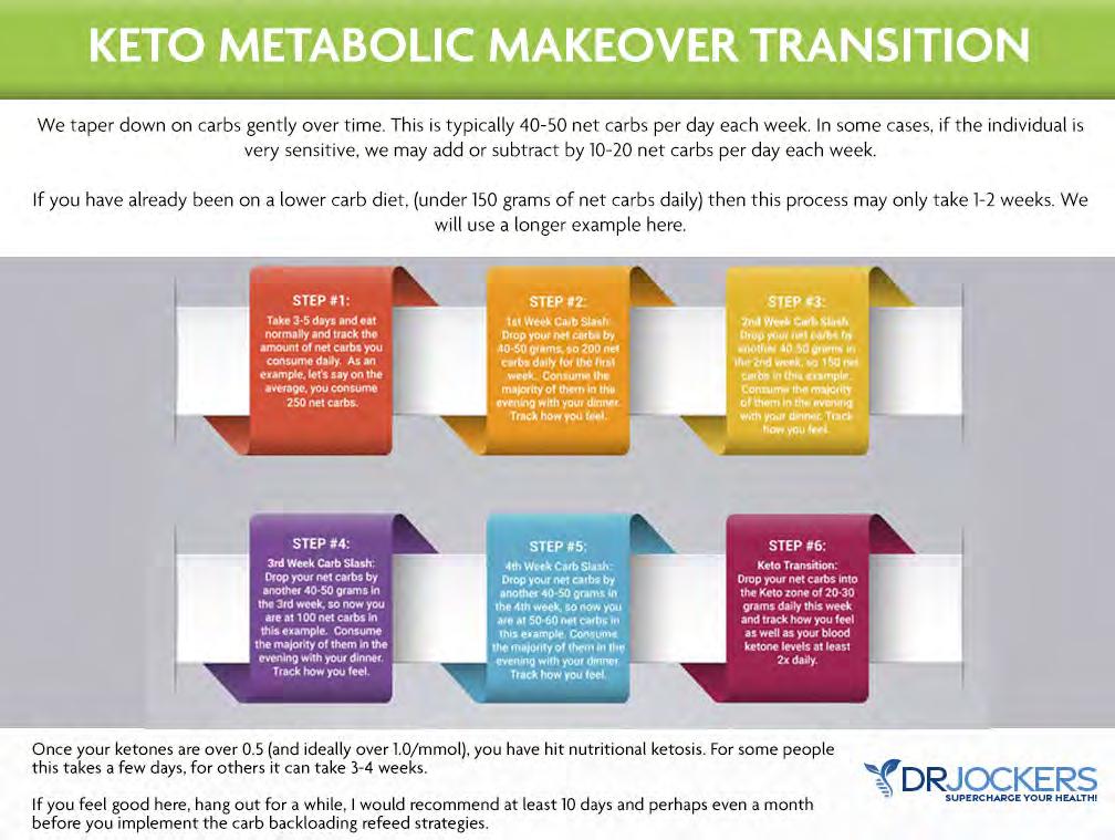 During your first week on keto, reduce your carbs during the daytime and focus on healthy fast instead. In the evening, you can add some healthy carbs, such as one sweet potato or one cup of carrots. The second week, reduce your evening carb intake by half to half a sweet potato or half a cup of carrots. For the next two weeks, stick to 70 percent fat, 25 percent protein, and 5 percent carbs in your diet. With this gradual approach, you will be set to live a ketogenic lifestyle. Overtime, you can also implement carb cycling strategies after you have developed the metabolic machinery to get into ketosis.