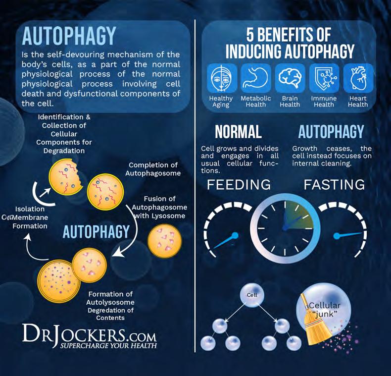 During times of nutrient deprivation such as fasting, exercise, etc. the body needs to load up on raw materials to fuel the metabolic machinery to produce the necessary energy for survival. To do this, the innate intelligence within our body signals to break down the older cells and cellular organelles that are working less efficiently to create newer cells that work to produce energy more efficiently (2).