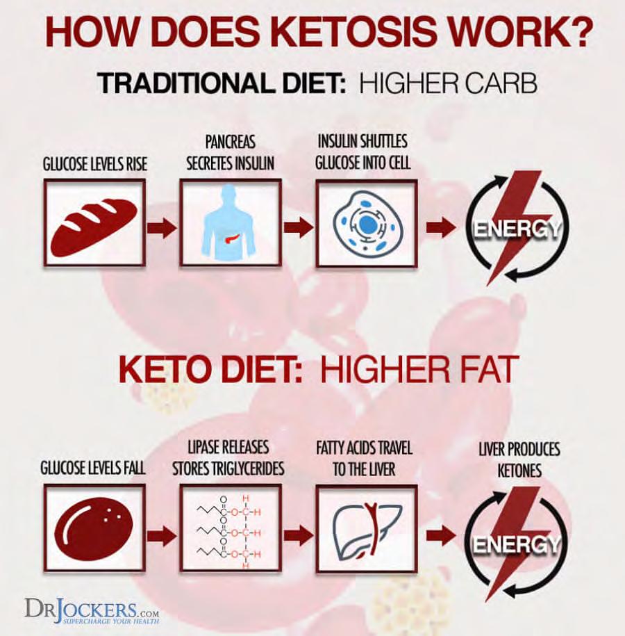 Most people in society are burning sugar in the form of glucose as their primary energy source. When we are in this sugar burning mode, we end up with large blood sugar fluctuations and higher insulin levels. This physiological process inhibits autophagy. A ketogenic diet is a high fat, low carb and moderate protein nutrition plan. This pattern of eating lowers blood sugar and insulin levels and causes the body to adapt to burning dietary fat and its own body fat for fuel. Ketones are byproducts of fatty acids that are more easily used to produce cellular energy and they can cross through the blood brain barrier to fuel the brain. Ketones are a preferred fuel for the body because they produce significantly more energy per molecule than glucose and they produce a lot less metabolic waste. They are a clean fuel source as opposed to the dirty fuel produced by burning sugar.