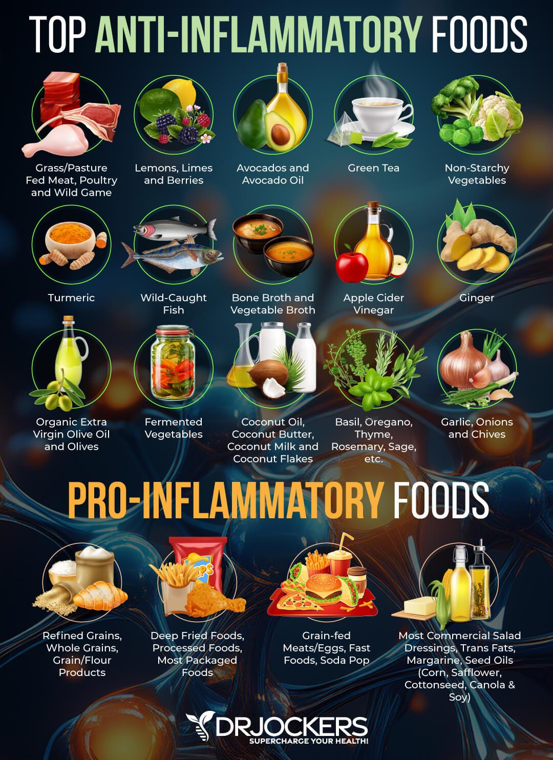 Instead, eat an anti-inflammatory diet with lots of greens, vegetables, low glycemic index fruits, herbs, spices, healthy fats, grass-fed meat, and wild-caught fish. ou can see the best foods and herbs to focus on in the image below.