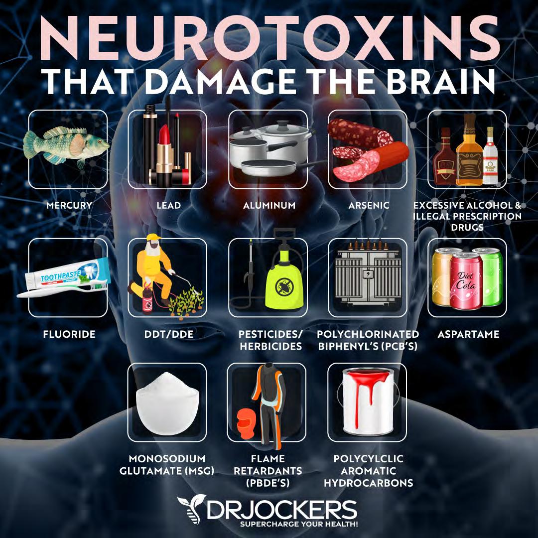 Neurotoxins, such as ethanol (in alcohol), glutamate, mycotoxins, nitric oxide, botulinum toxin (in Botox), tetrodotoxin, and tetanus toxin, are particularly damaging to your neurological functioning. Environmental toxicity may lead to memory problems, brain fog, dementia, neurodegenerative diseases, mood swings, irritability, fatigue, anxiety, depression, and mental health issues (21, 22, 23).