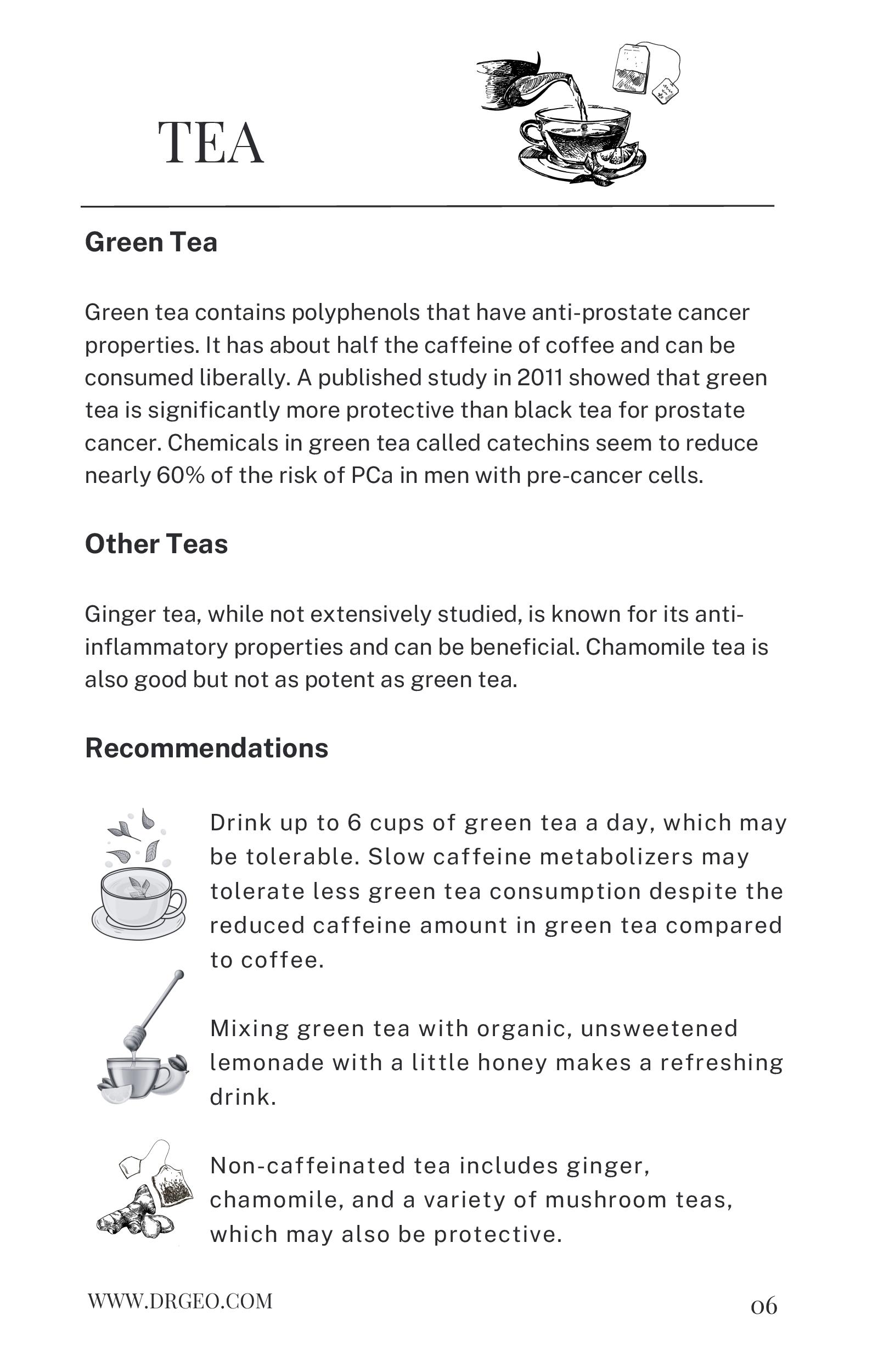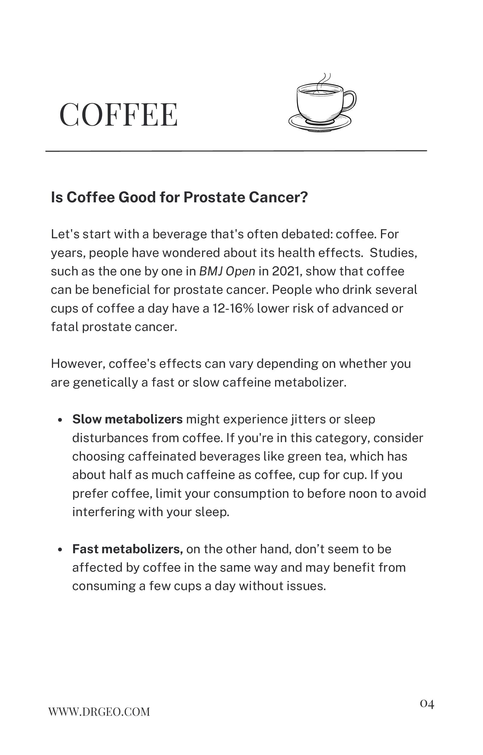 In this special edition, Dr. Geo explores the impact of various drinks on prostate health, covering everything from coffee and tea to alcoholic beverages, water, juices, and smoothies. Whether you're aiming to prevent prostate cancer or seeking to optimize your health post-diagnosis, this eBook provides insights and practical advice to help you make informed decisions about what you drink.