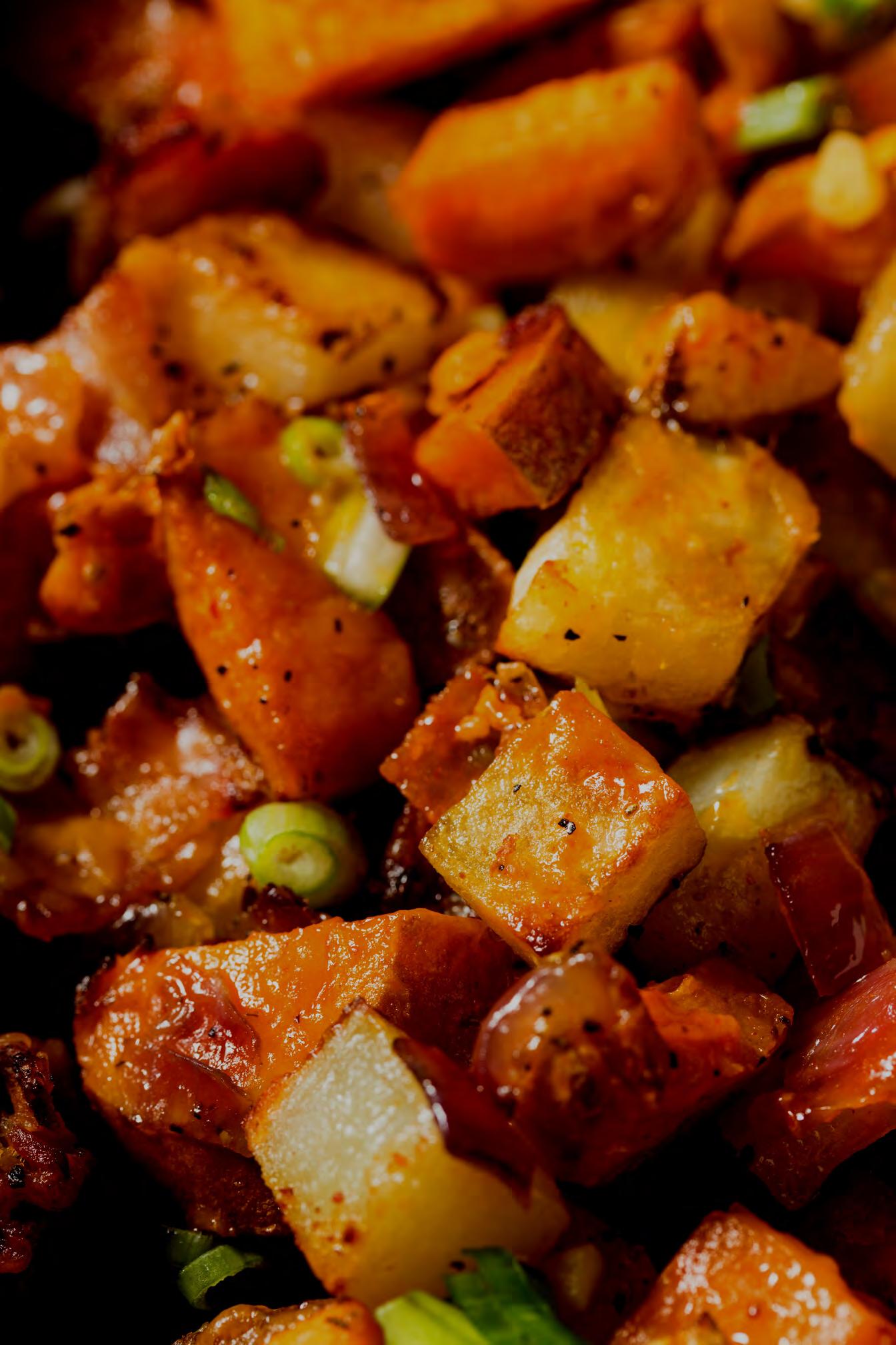 1. Mix the potato cubes with the onion and seasonings. Spread on a tray lined with parchment paper. Bake at 400 degrees for about 40 mins. Stir after 20 minutes.