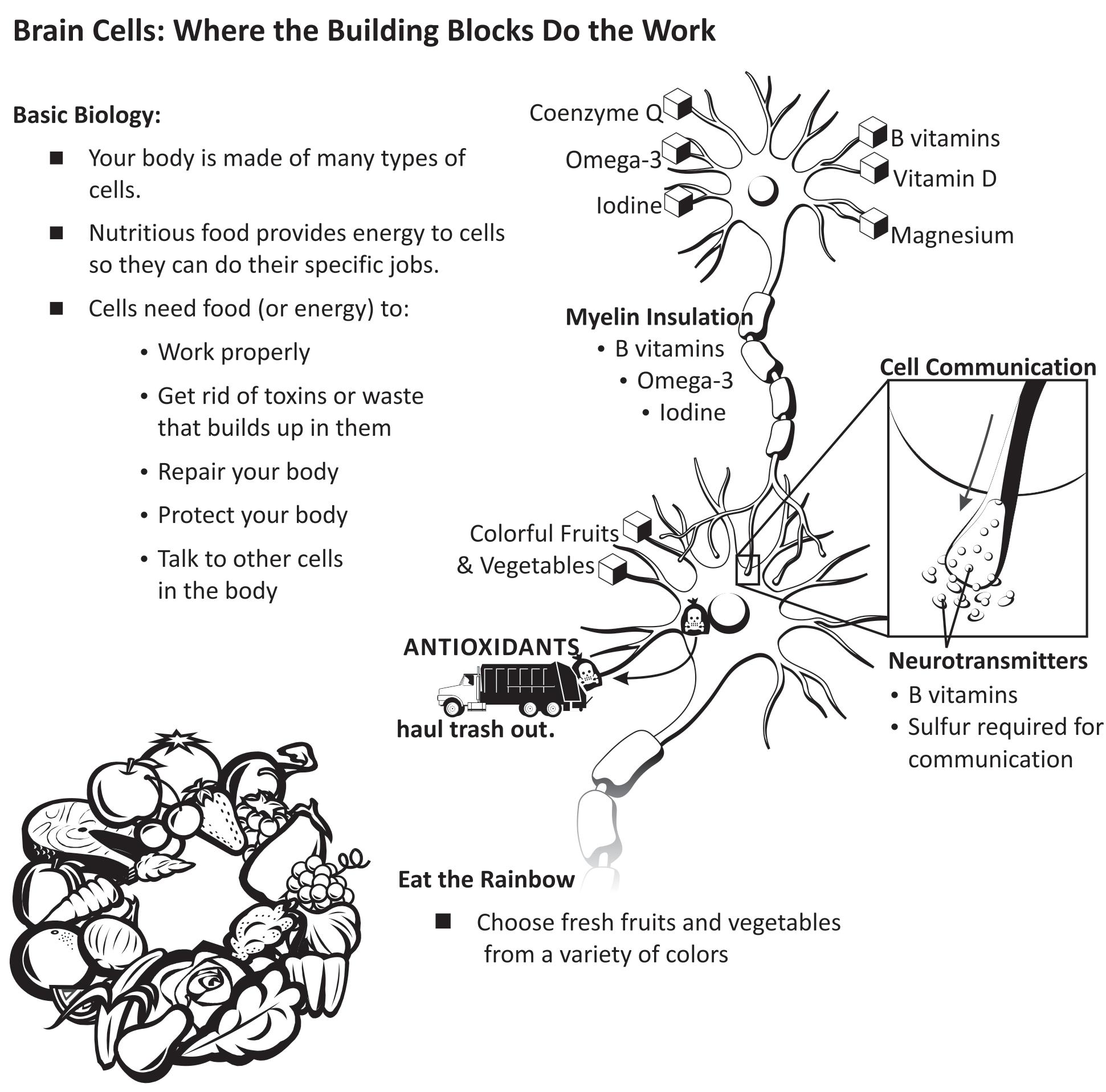 Myelin is the fatty insulation around the nerve cells. There are 10 billion brain cells with 10 trillion connections. All that connective wiring must be insulated with myelin. However, your doctor probably didn’t tell you which nutrients your brain cells need to function optimally, not to mention repair damage. Your doctor probably doesn’t even know about this, as physicians receive very little nutrition training. However, I know. To make healthy myelin, you need to consume thiamine (vitamin B1), folate (vitamin B 9), cobalamin (vitamin B12), omega-3 fatty acids (in particular, docosahexaenoic acid, or DHA), vitamin K, and iodine. (Later in the book I’ll tell you what foods you need to eat to be sure you have all these essential building blocks on hand.)