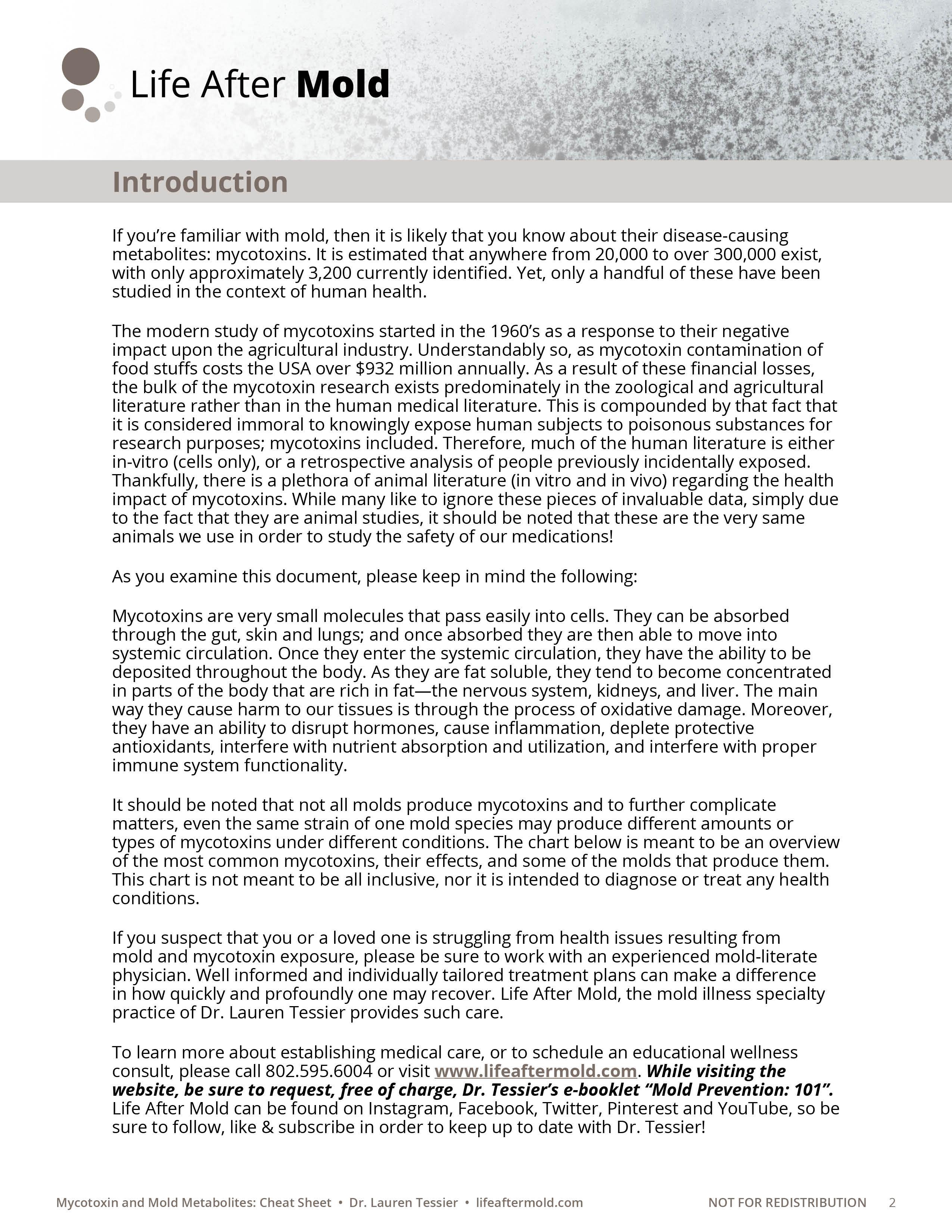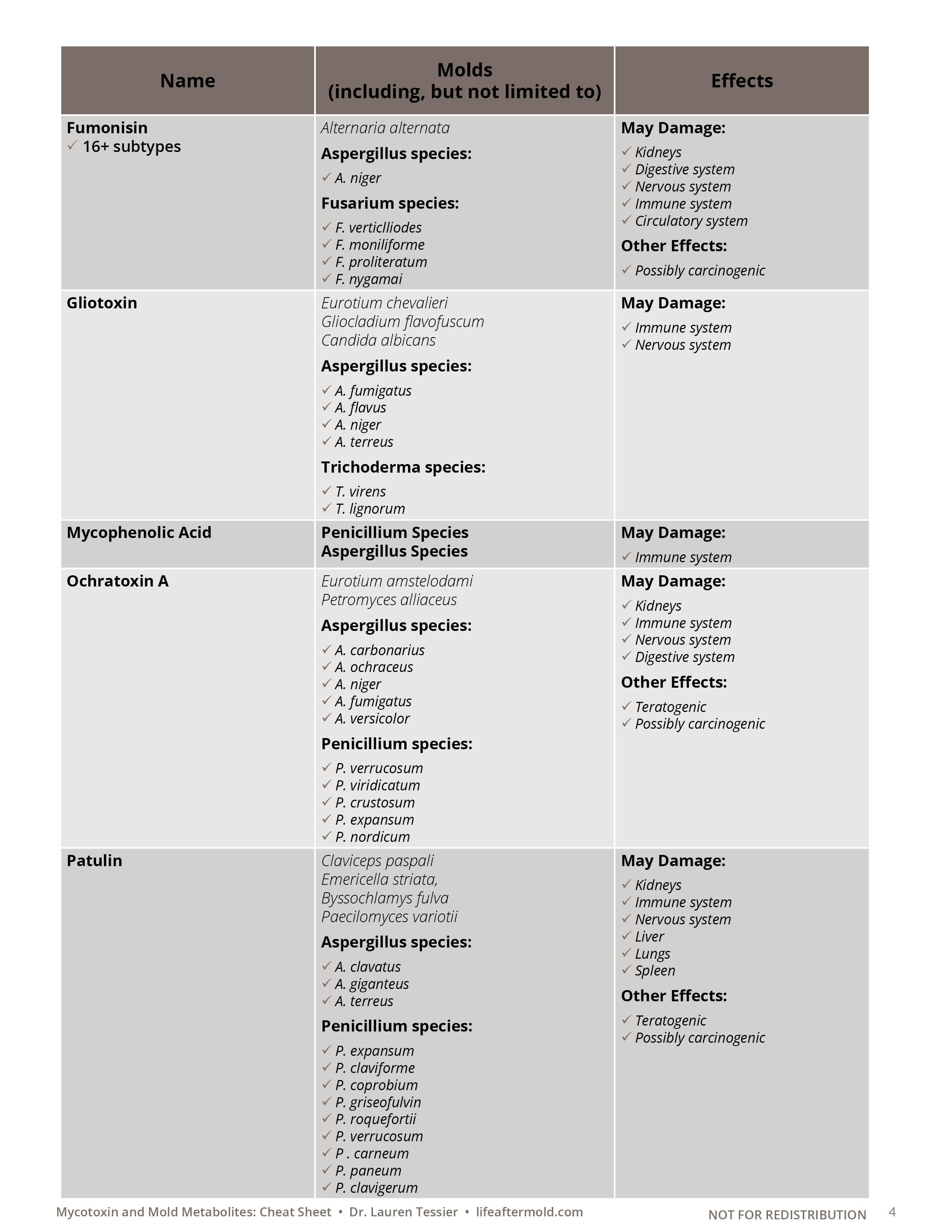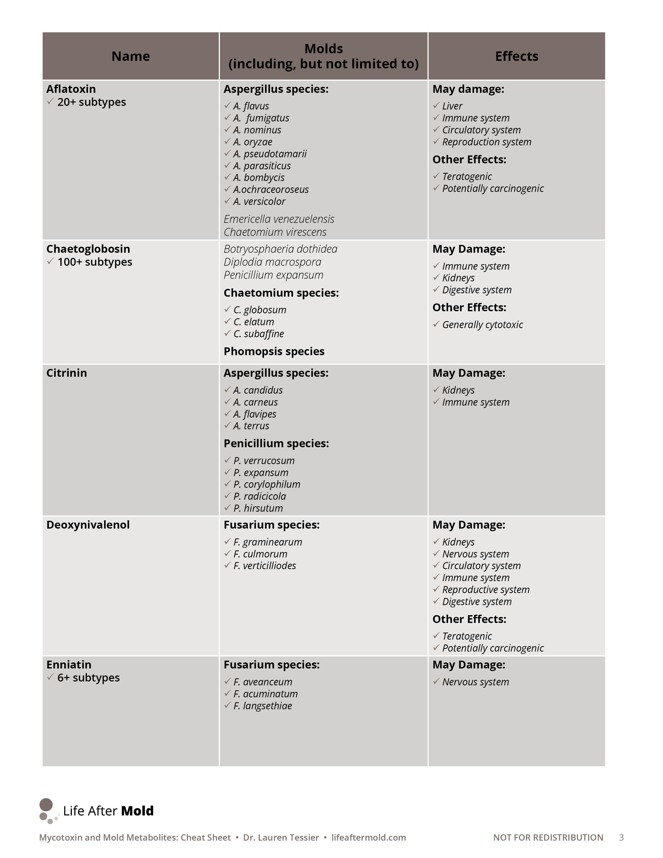 Dr. Tessier’s “Mycotoxin and Mold Metabolites: Cheatsheet”, can help you understand the health impacts of these toxins, as well as potentially understand the source of your elevated mycotoxin levels!