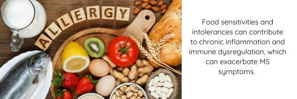 FoodSensitivities Foodsensitivitiesandintolerancescancontributetochronicinflammationandimmunedysregulation, whichcanexacerbateMSsymptoms.Commonculpritsincludegluten,dairy,andcertainfoodadditives. IdentifyingandeliminatingfoodsensitivitiesthroughdietarychangesandimplementinganantiinflammatorydietcansignificantlyimproveMSsymptomsandoverallhealth.