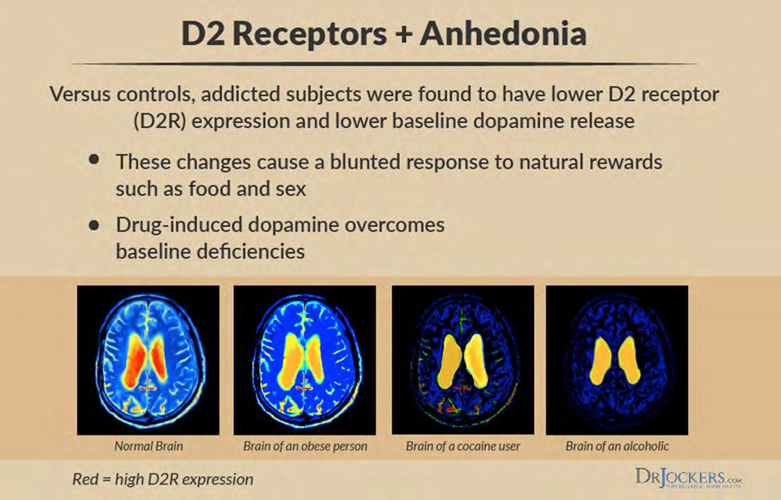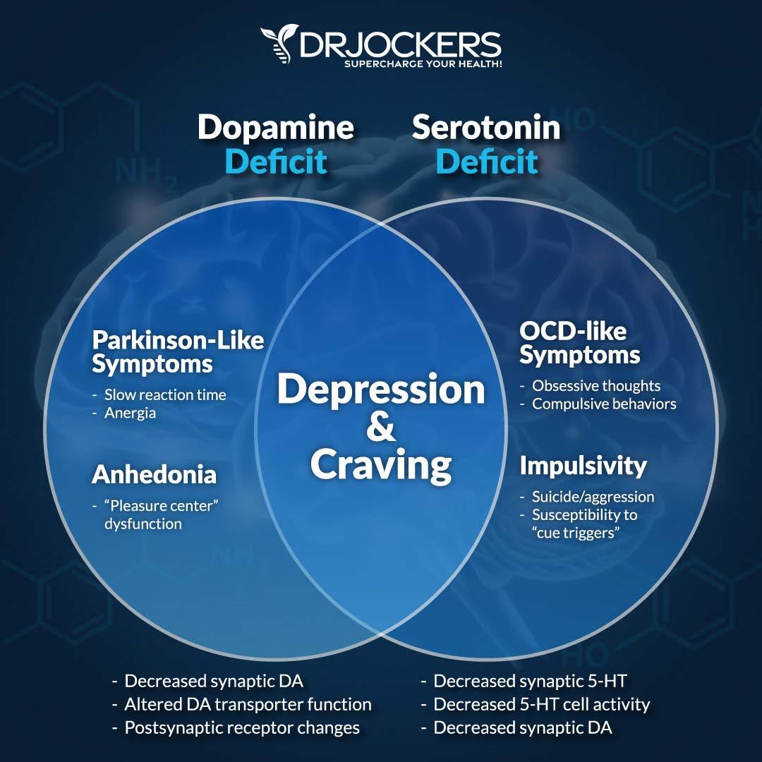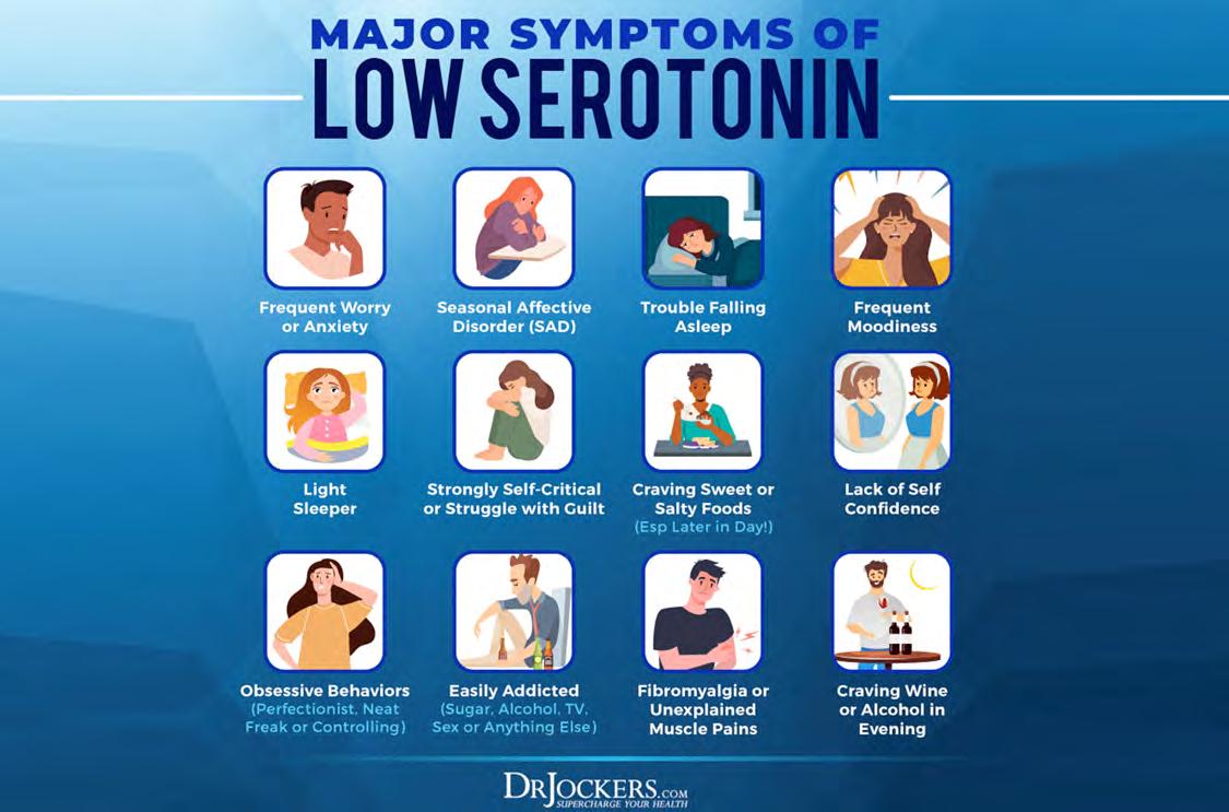 Both serotonin and the neurotransmitter dopamine as well as endorphins play a role in mood and overall sense of well-being. When dopamine is low, the individual will have slower movements and low overall drive toward goals. They can also develop Parkinson’s like symptoms. When individuals are not producing endorphins, they will have chronic pain and lack of pleasure in anything they do. Individuals with low endorphins will also have trouble controlling their emotions and will tear up very quickly.