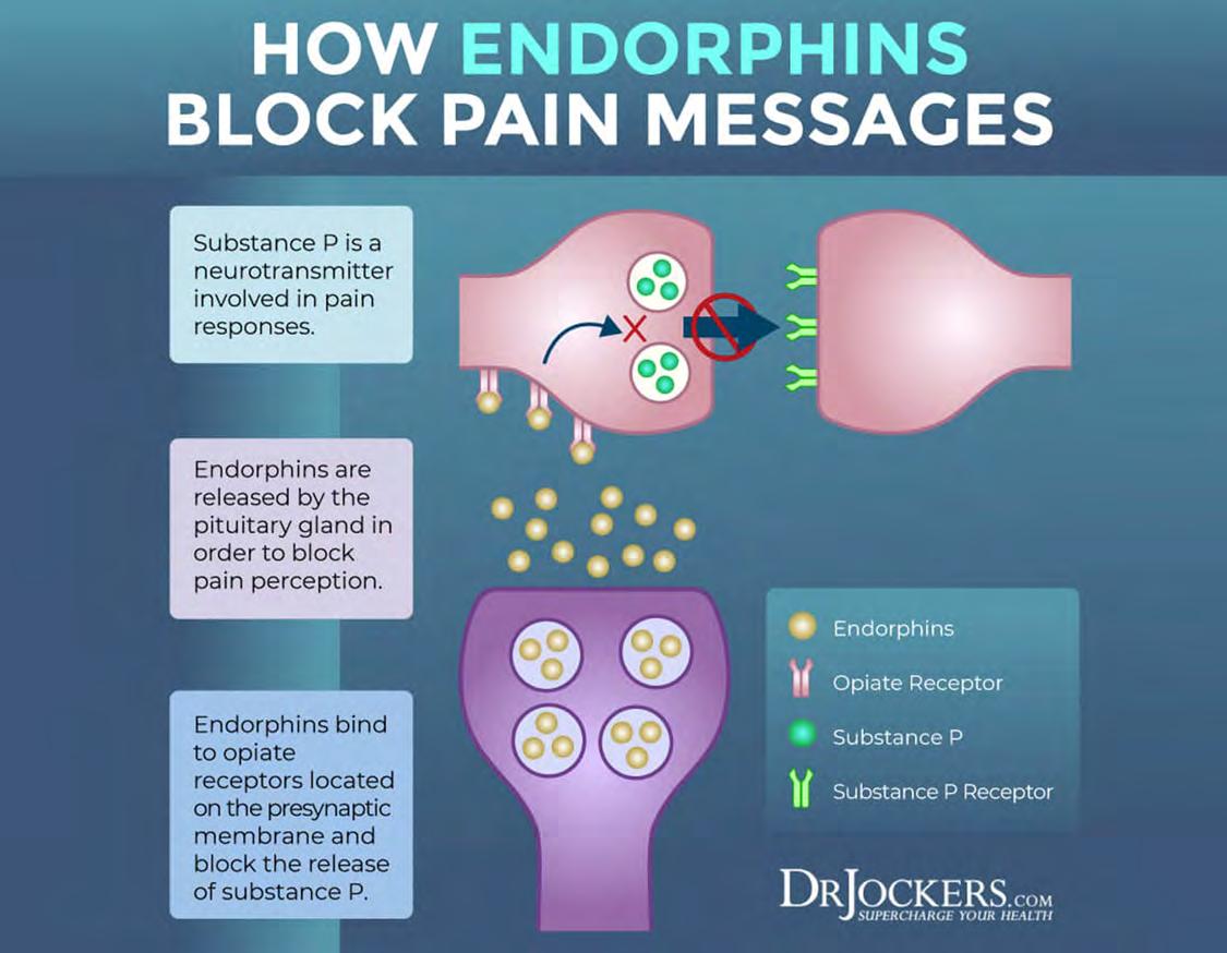 Endorphins are feel good neurochemicals that give us a state of euphoria and provide a mechanism of pain relief. These molecules interact with the opioid receptors where they block pain receptors.