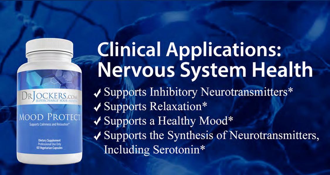 Mood Protect: Combination of herbs, nutrients and compounds that promote serotonin and GABA production to ease anxiety and improve overall mood and sleep. This product has clinical dosages of GABA, taurine, L-theanine and 5-HTP. This also contains small amounts of zinc, B6 and magnesium to improve natural GABA production.