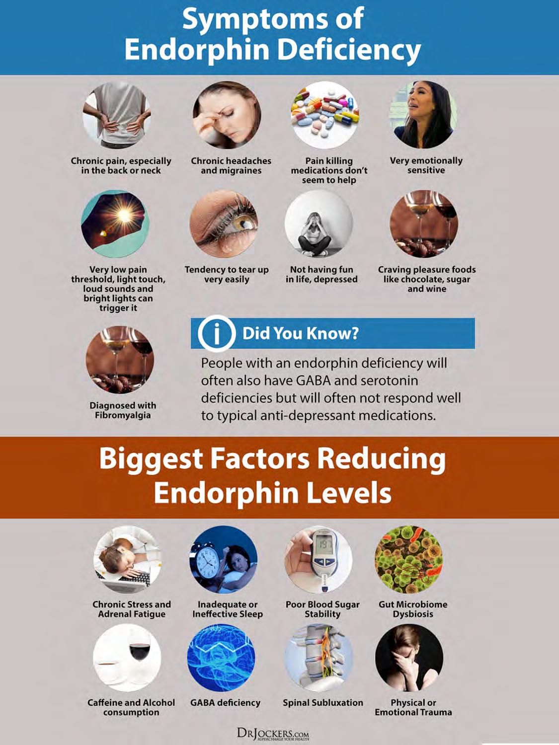 If your score is 15 or more you are probably experiencing symptoms associated with a loss of endorphins. Endorphins are feel good molecules your body produces that block pain receptors and give a sense of joy and euphoria.