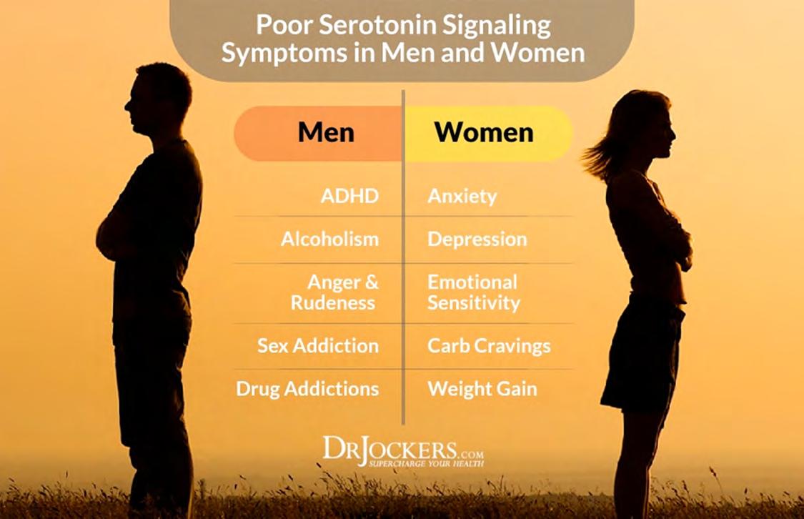 Although poor serotonin signaling symptoms are wide ranging with lots of cross over between sexes, they are twice as likely to impact males and females in the following ways.