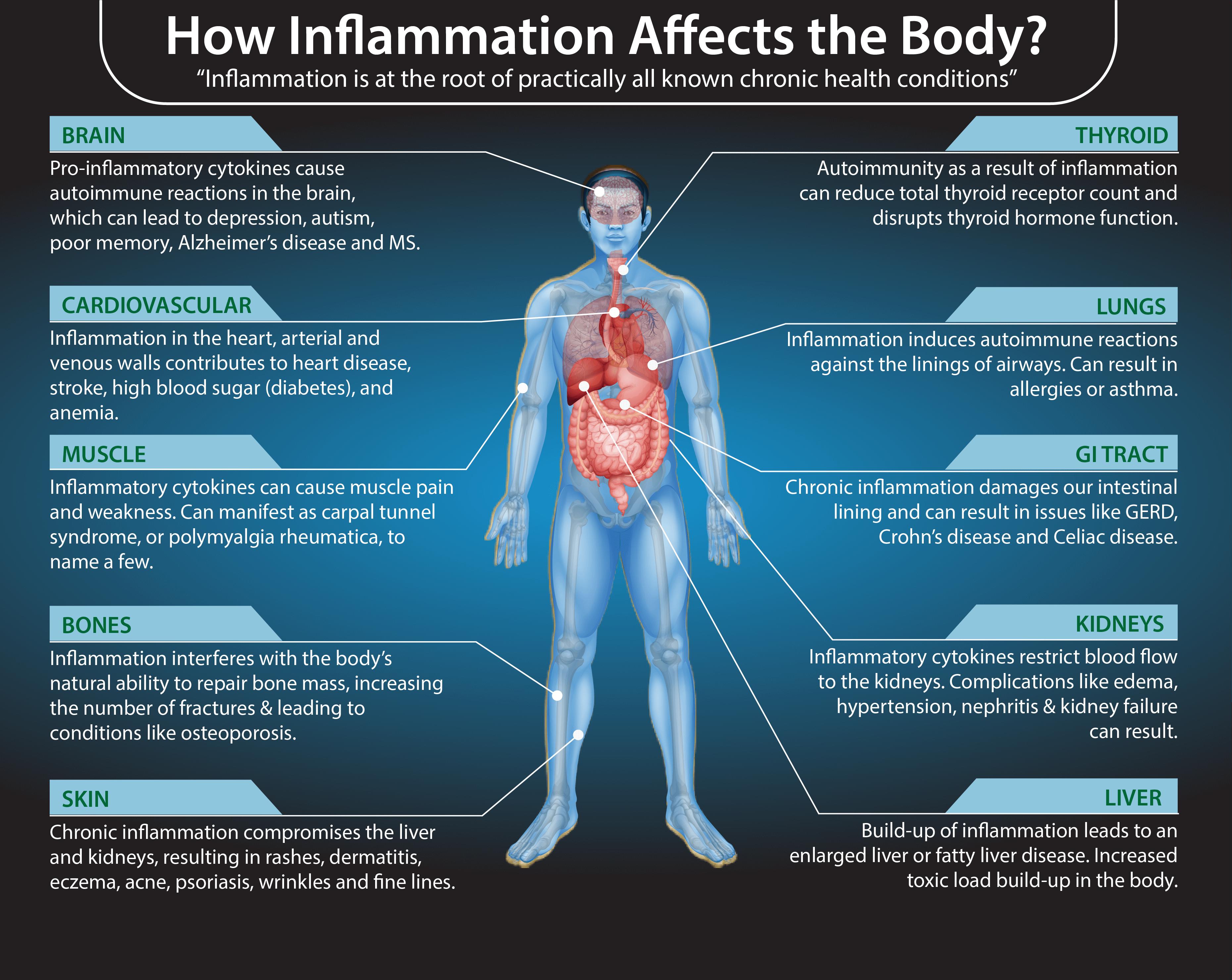 Chronic inflammation can affect all areas of your body, including your digestive system, kidneys, liver, lungs, brain, endocrine system, hormonal health, heart, skin, muscles, and bones. According to a 2015 article published in theBritishJournalofNutrition explains, chronic, low-grade, systemic inflammation is likely involved in the early stages of disease development (2).