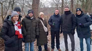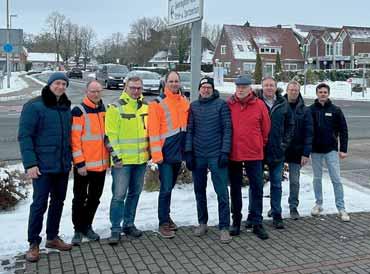 Beim Pressetermin im verschneiten Remels (von links): Bürgermeister Heinz Trauernicht, Michael Kuhn (Nds. Landesbehörde für Straßenbau und Verkehr, Fachdienst Tiefbau), Uwe Welzel (Landkreis Leer, Leitung Straßen- und Tiefbauamt), Frank Buchholz (Leiter Nds. Landesbehörde für Straßenbau und Verkehr), Hilko Kruse-Edenhuizen (STRABAG, Ortsvorsteher Peter Walde, Heinz Brunken (Vorsitzender Bau- und Entwicklungsausschuss), Hinrich Becker (Leiter Bauamt) sowie Eike Grüssing (STRABAG). Foto: Gertrud de Buhr