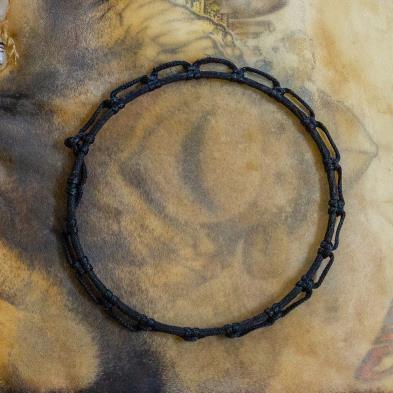the head of the shell. The goat skin tightens as the verticals are woven back and forth through the rope loops between the top metal ring and the bottom one. It is a slow process to increase tension over time so as not to stress the skin too much initially, but over a period of a few days the verticals are tightened and tightened.