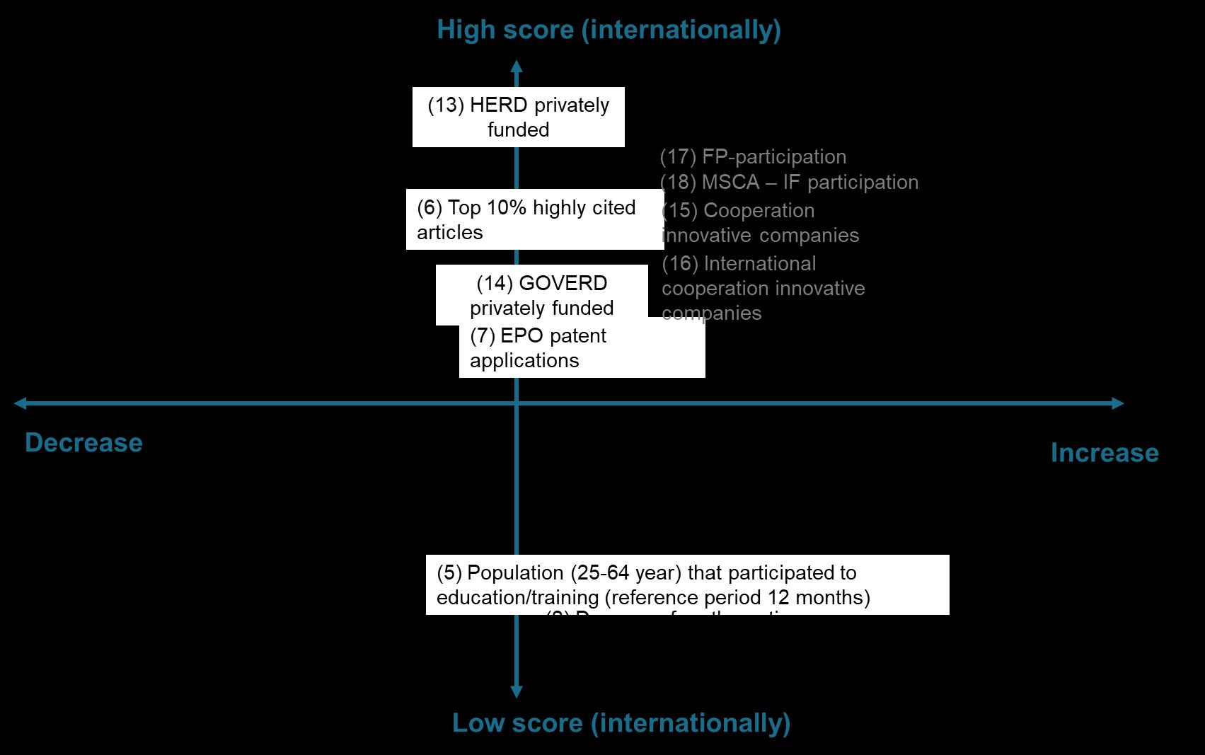 - Voor het aandeel innovatieve bedrijven, GERD als percentage van BBP en het O&O-personeel (als aandeel van de totale beroepsbevolking) observeren we doorheen de tijd een positieve evolutie. Voor deze indicatoren bevinden we ons vandaag bij de top van de EU.