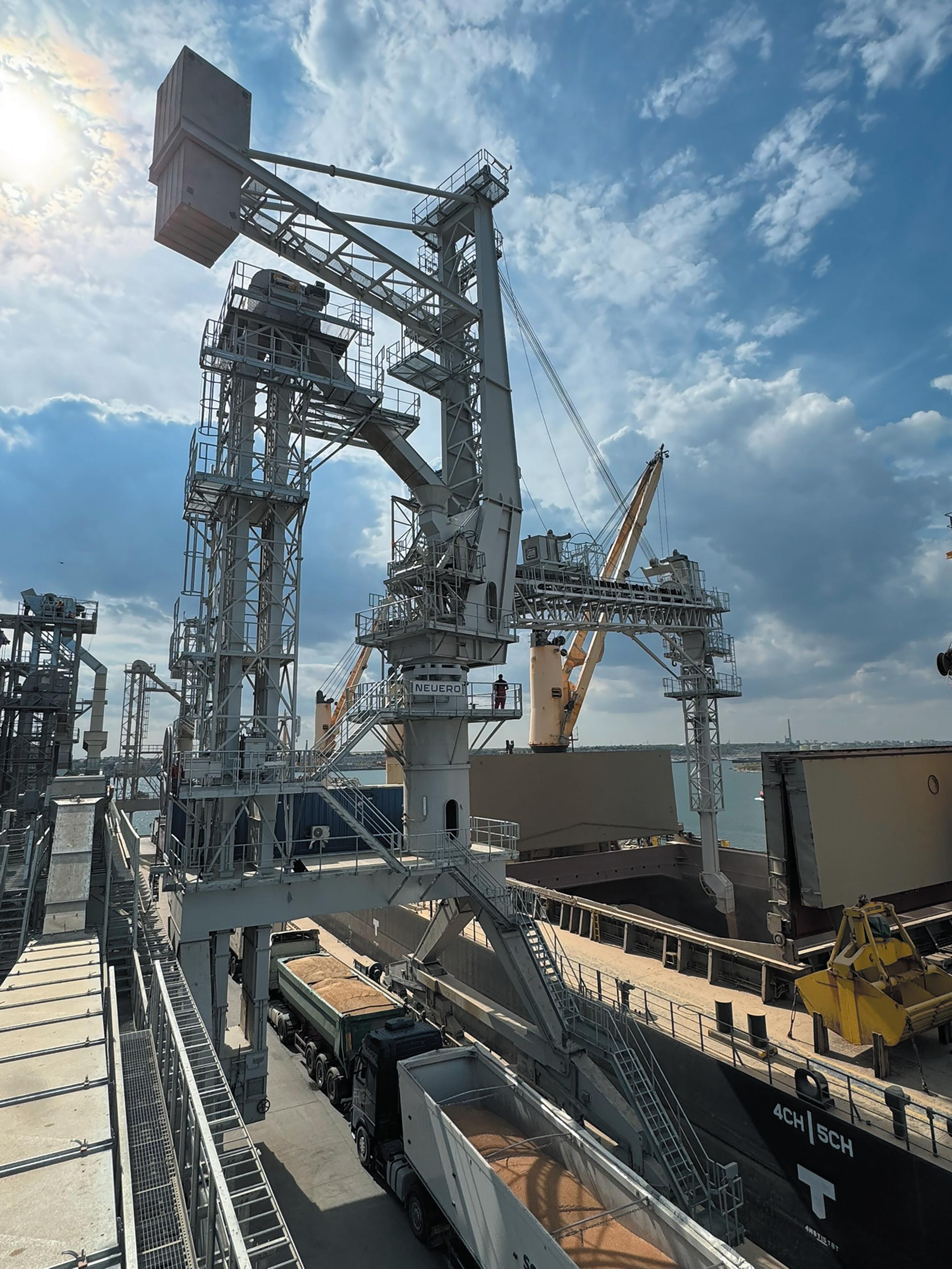Bedeschi supplied a fully mobile v shiploader on rubber tyres that can load grains and oilseeds on Panamax ships at a capacity of 1,000tph, received from trucks on a two-lane drive-over hopper that is fully integrated and mobile with the shiploader itself. The product is weighed and cleaned by a twin set of scalpers, sample according to local standards and finally load product dust free.