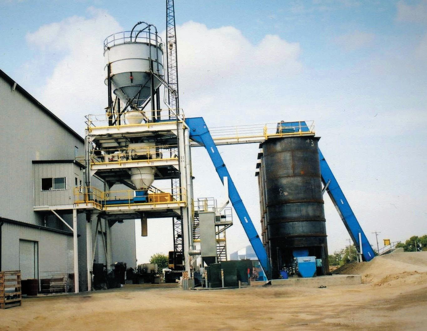 Storage silos and day bins provide v large-volume storage for bulk materials, providing a buffer supply so the plant has a continuous material source. These are often equipped with conveying connections to move material downstream.