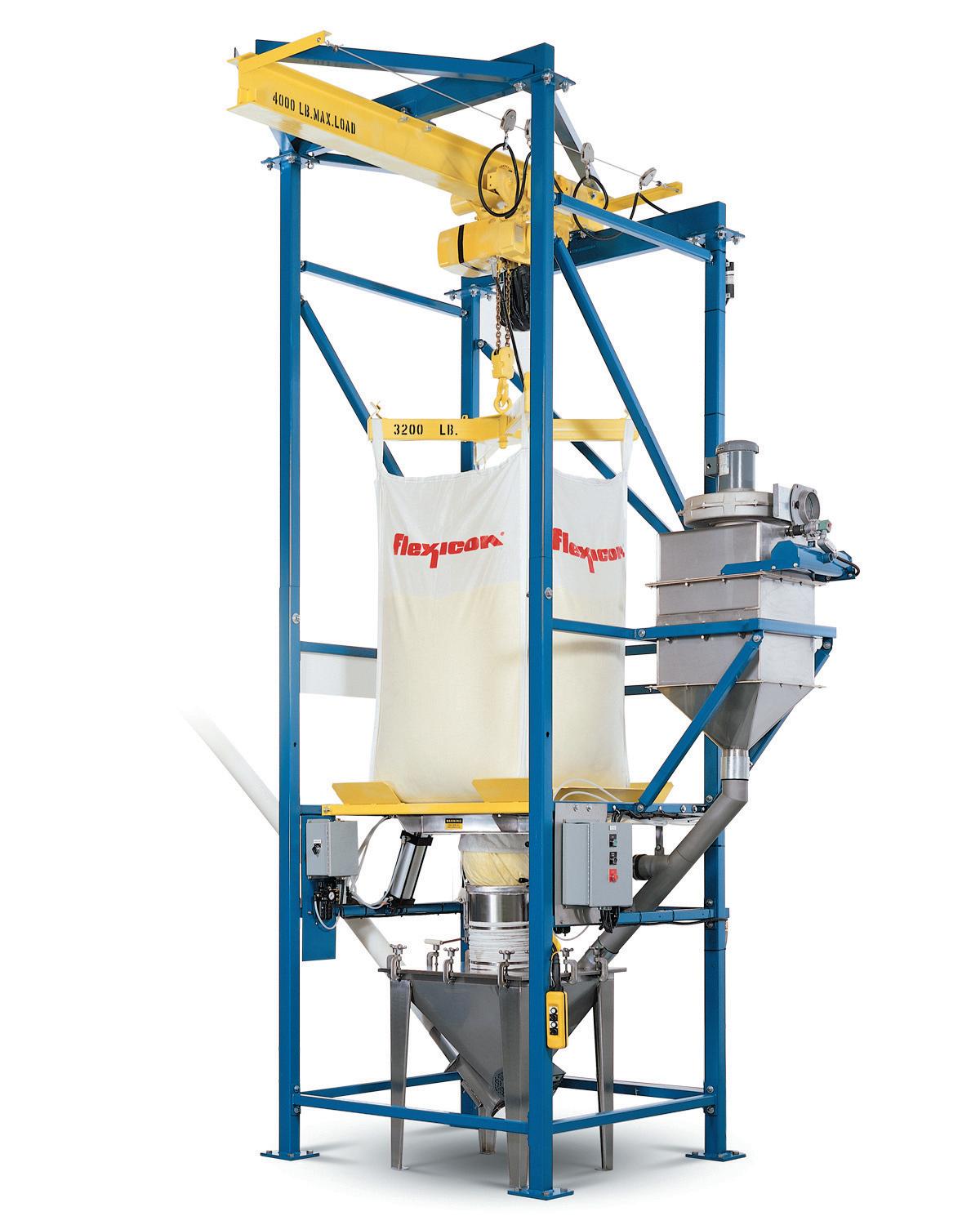 Bulk bag (also known as big bags or v FIBC) dischargers with hoist-andtrolley or forklift-loaded frames, bag activation and flow promotion devices discharge intact grains, milled flours, starches, and bran from bulk bags. Container, drum, and box tippers v feature a lift-and-seal option that creates a dust-tight connection between the tipper hood and the container.