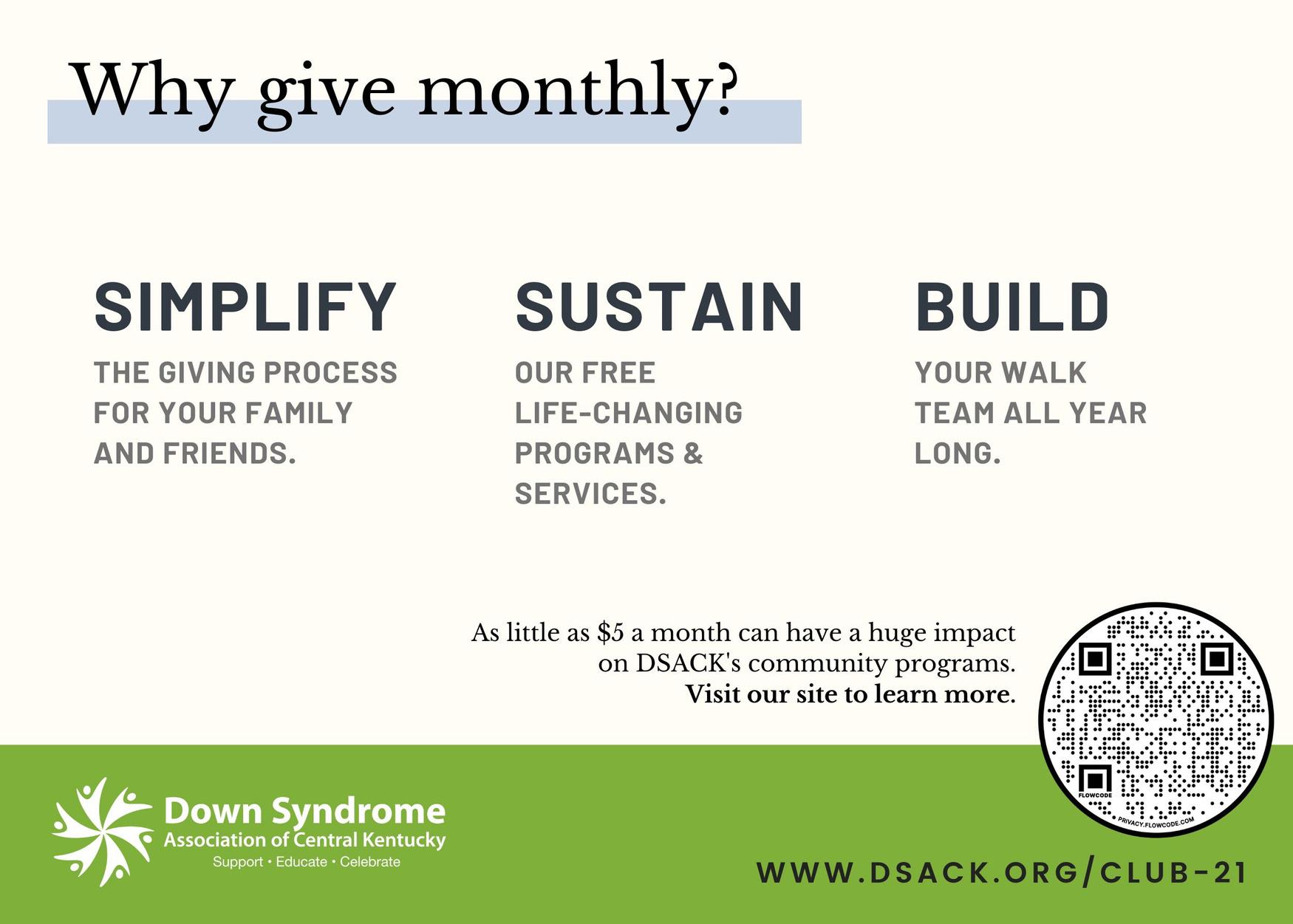 Giving monthly can be a more budget-friendly way to give, while allowing DSACK a better sense of funds coming in each month For those who are raising money for your walk team, your monthly donations are credited to your team!