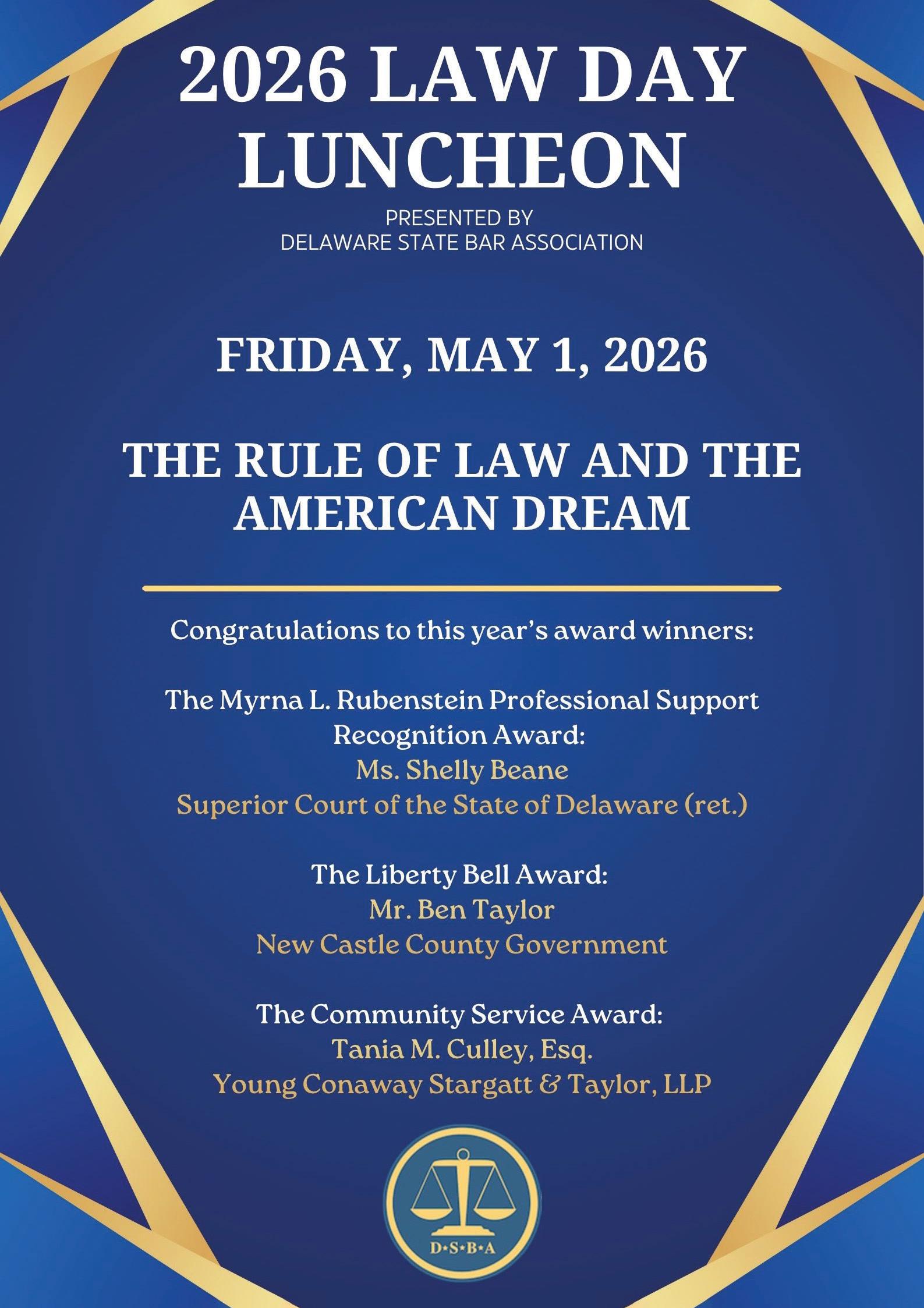 The Delaware State Bar Association (“DSBA”) hosts its 2026 Law Day Luncheon on Friday, May 1, 2026 at the Riverfront Events Center, as part of its annual Law Day celebration. This year’s Law Day theme is “The Rule of Law and the American Dream,” focusing on how the legal system protects liberties and helps enable the pursuit of goals.