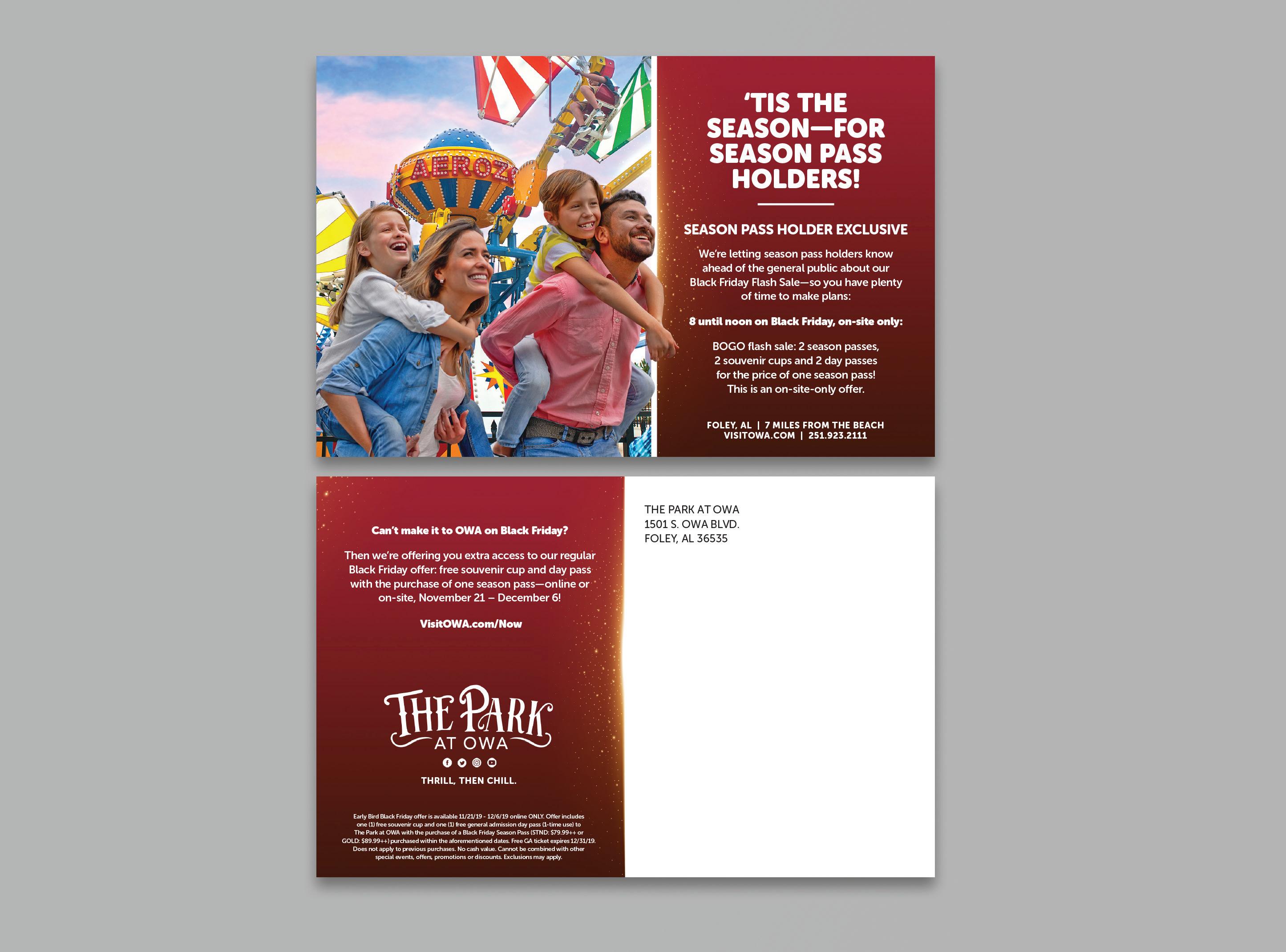 Research painted a picture of a consumer confused by the brand and its offerings. We streamlined the brand identity and divided the ticketed and nonticketed offerings in the simplest way possible: as The Park at OWA and the no-admission-required Downtown OWA.