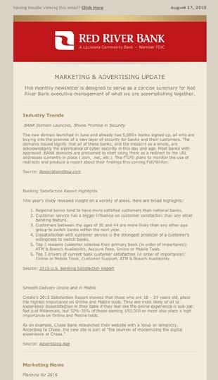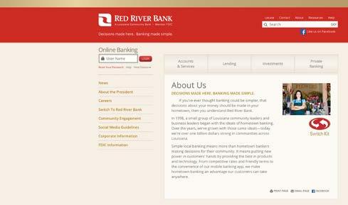 redriverbank.net Retail Print Ad (2015) redriverbank.net - 318.675.2900 A bank made in Louisiana. A bank made for Louisiana. redriverbank.net 318.675.2900 A bank made in Louisiana. A bank made for Louisiana. Retail Sponsorship Ads (2015) Checking Digital Ad (frame 1) (2015) (frame 2) (frame 3) redriverbank.net Bank anywhere with our mobile app. Retail Outdoor (2015) SECTION 2 : ADVERTISING - RETAIL 12