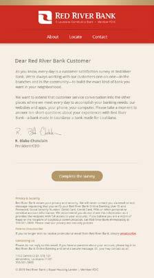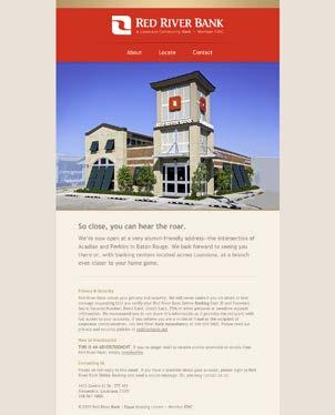 E-Blast (2016) Print Ad 6.875 x 4.891 (2016) So close, you can hear the roar. Visit our new branch at Acadian and Perkins. Made in Louisiana. Made for Louisiana. redriverbank.net 2591 S. Acadian Thruway • Baton Rouge, LA 70808 • 225-412-5600 Operation Doorstop Postcard (front view) 5 x 8 (2016) (back view) 5 x 8 (2016) Visit us at Acadian & Perkins! 412- 5600 2591 S. Acadian Thruway Karen Boss Retail Market Manage Tanya Hodges Assistant M ag Enjoy the per fect blend of products and services. Personal Accounts Total y REE Ch cking Advan age Ch cking Supe io Che k ng S n or P atinum Chec ing Mone Ma ke nves men Accoun Basic Sav ng Commercial Accounts • Small Bu ines Chec ing Comme c al Chec ing Business Check ng w th n e es • Business Mone Ma ke n estmen Business Savings pen Ba Personal Loans Automob e Bo t & RV Secu ed & Unsecur d Residen ia Con uc on Land oan Home Mo tgage Loans Commercial Loans Se u ed & Unse u ed Revo ving nes o C ed Real E ta e Construc on Gove nmen Gua an eed Let er of C edi pen Communi Membe FD Made in Louisiana. Made for Louisiana. How have we built a community bank that’s $1.5 billion strong? 6,000 very smart moves. That’s how many people moved to Red River Bank last year alone. And our latest move? Our new location at Acadian and Perkins. Visit us today. SECTION 7 : GRAND OPENINGS 75