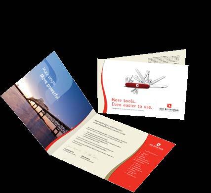 From the bank made for Louisiana: a card made for you. Get started today— get the card made for you. redriverbank.net More than our logo on the front of a card. It’s all of us standing behind your card. Introducing Red River Bank’s personal credit card. Offering something other credit cards can’t: Red River Bank’s service. RRB Rewards VISA • No annual fee • RRB rewards program • 0% balance transfer fee • 0% introductory rate for 6 months • Four variable-rate pricing tiers (inside view) Consumer Collateral 18 x 4 (front view) (2016) (back view) SECTION 8 : PLASTICS - CONSUMER 79